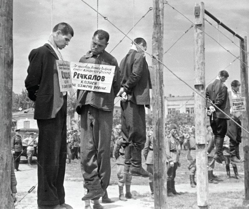 Казненные в Краснодаре советские коллаборационисты, служившие в айнзацкоманде 10а, выполнявшей карательные операции в отношении мирного населения на территории Краснодарского края в зоне действия 17-й армии вермахта. Айнзацкомандой руководил оберштурмбанфюрер СС Курт Кристман, всего в ней служило до 200 человек. Это был первый в мире открытый суд над пособниками нацистов. На процессе в Краснодаре 14–17 июля 1943 года обвинялись члены айнзацкоманды 10а и их помощники: Кладов, Котомцев, Ластовина, Мисан, Напцок, Павлов, Парамонов, Пушкарев, Речкалов, Тищенко, Тучков. Председателем суда был полковник юстиции Майоров, представитель Военного трибунала Северо-Кавказского фронта, государственным обвинителем – генерал-майор юстиции Яченин. Обвиняемых защищали три назначенных судом адвоката. Для доказательства вины были процитированы акты ЧГК, заслушаны 22 свидетеля, зачитаны выводы медицинской экспертизы по вскрытию 623 трупов (85 детей, 256 женщин и 282 мужчин, в том числе 198 стариков), из них 523 жителя погибли от газов, 100 – от выстрелов в голову. Под грузом доказательств все подсудимые полностью признали себя виновными в пособничестве немецким захватчикам, в зверствах над населением Краснодара и Краснодарского края. Военный трибунал приговорил к смертной казни через повешение главных палачей: Тищенко, Речкалова, Ластовину, Пушкарева, Мисана, Напцока, Котомцева и Кладова. Приговор был приведен в исполнение 18 июля в 13 часов на городской площади Краснодара. Казнь смотрели от 30 до 50 тысяч жителей города и близлежащих станиц. На приговоренных висела табличка «Казнен за измену Родине». Менее активные пособники Тучков, Павлов и Парамонов получили по 20 лет исправительно-трудовых лагерей. Июль 1943 г.