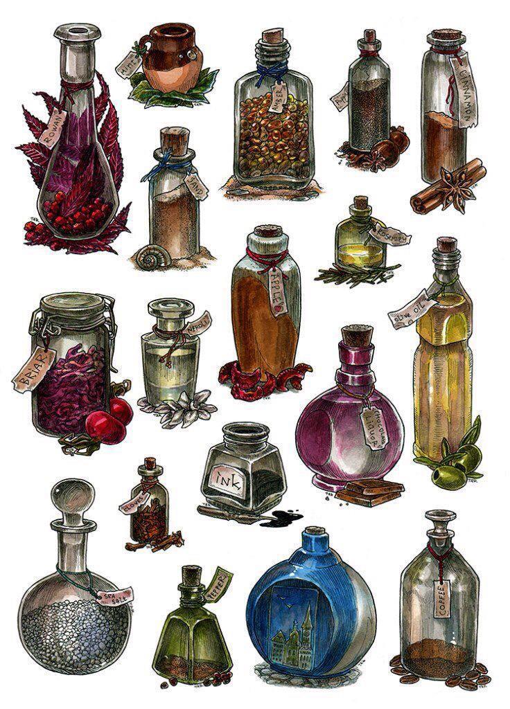 Какие-то предметы, ассоциирующиеся с ней: бесконечные банки и склянки зелий, которые она варит. И нож для вскрытия писем.
