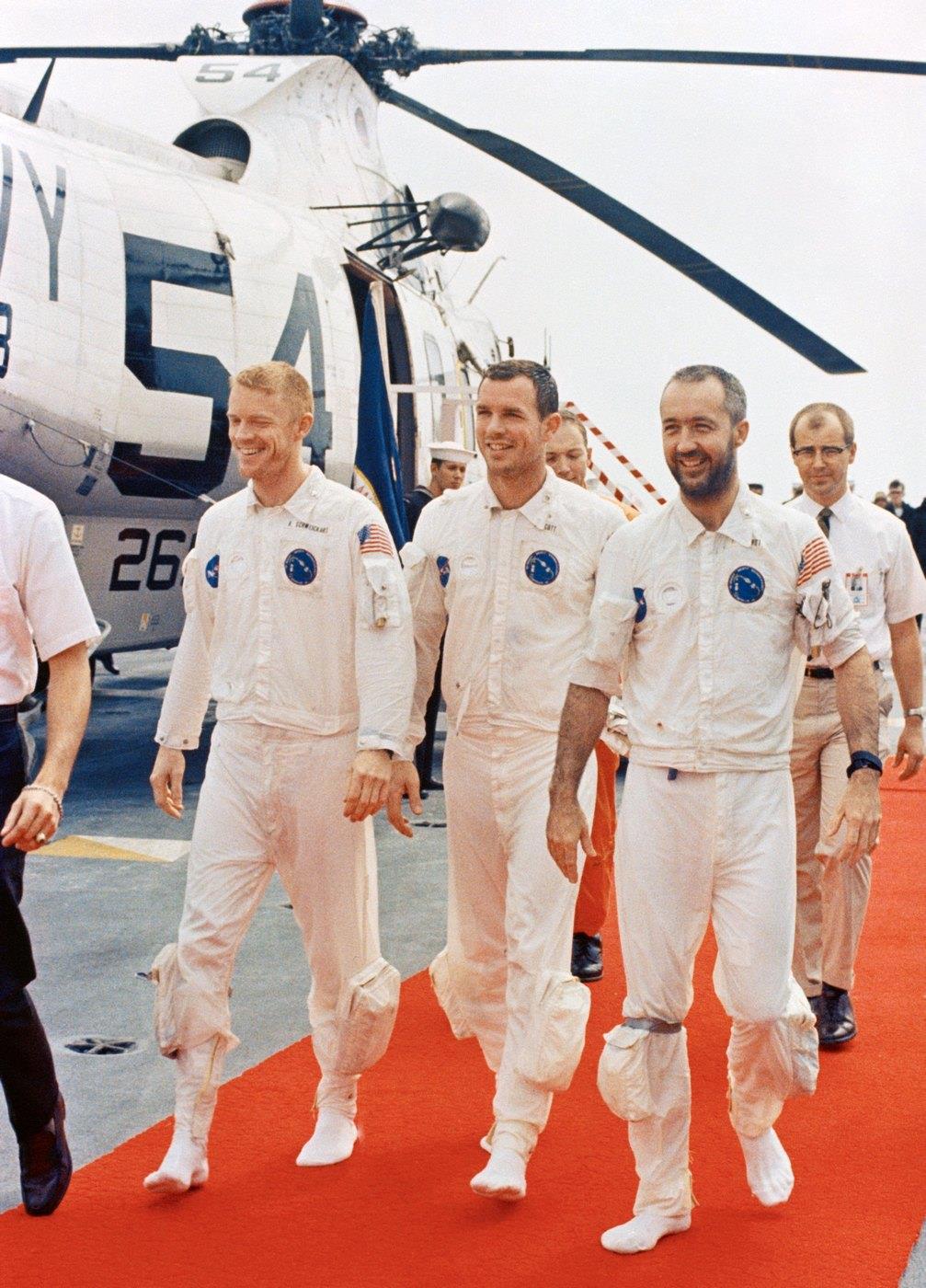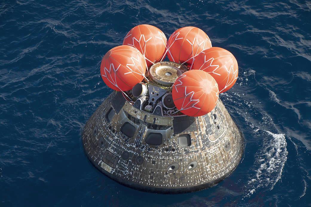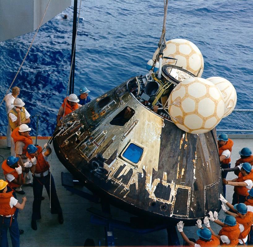 А вот на этой фотографии один из тех самых «Аполлонов» только что вернулся из полёта в космосе. Фольга, правда, немного облезла с него лоскутами, но отлично видно, что корпус корабля вполне выдержал испытание огнём: