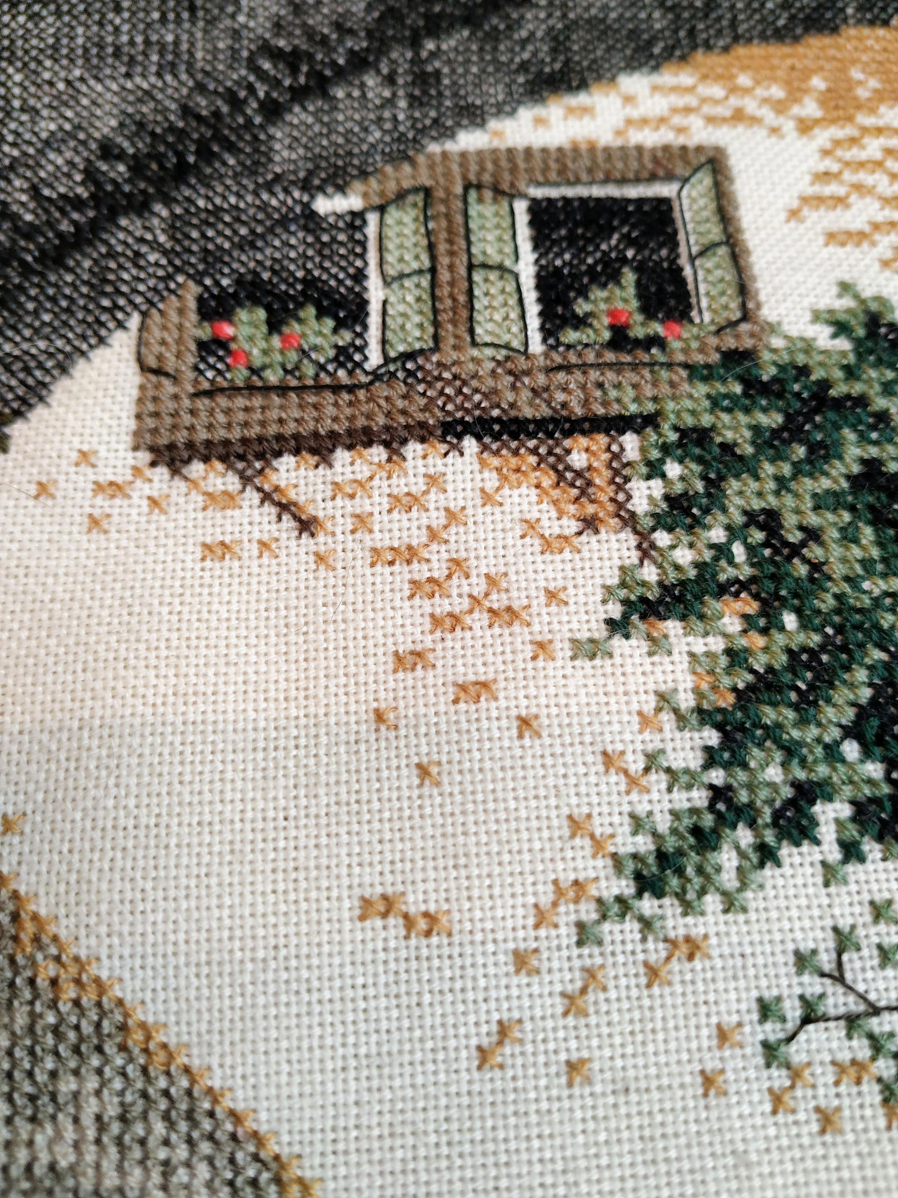 Первой вышила эту. В оригинальном наборе она должна быть вышита на бежевой канве. Канва - это такая специальная ткань с дырочками. На ней удобно вышивать крестиком. Она бывает разного размера (каунта), то есть клеточки эти на ней. Но этот сюжет мне виделся иначе. Так как картина предполагалась с неполной зашивкой и несчетным бекстичем (это вот как раз элементы, которые выглядят как контур, тоненькие линии), то я заменила канву на равномерку - ткань без дырочек/клеточек. Чтобы на ней вышивать, надо самостоятельно считать ниточки переплетения. Зато получается красивее))