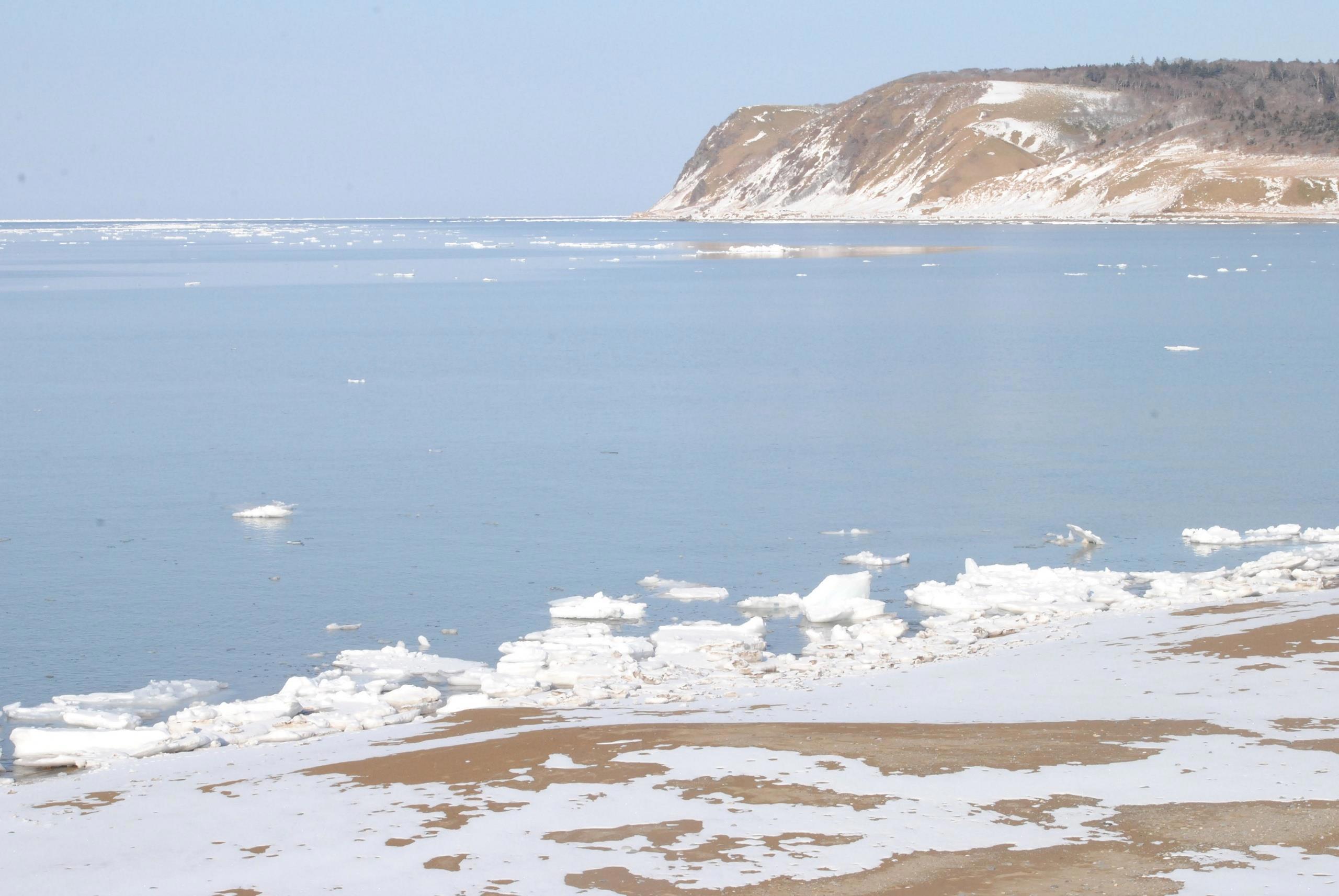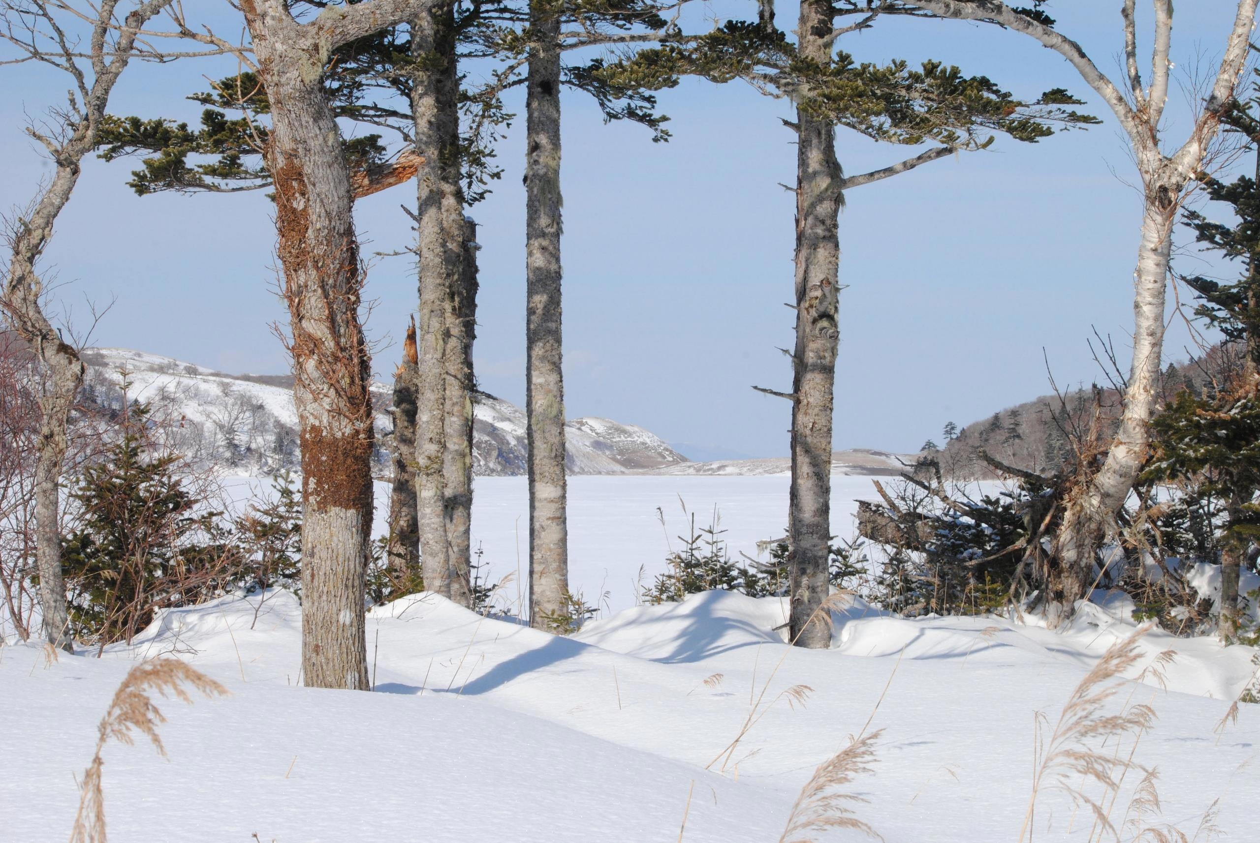 Сквозь деревья виден берег Песчаного (я выбрался на лед за перешейком полуострова Аппендикс (реально, такое название)