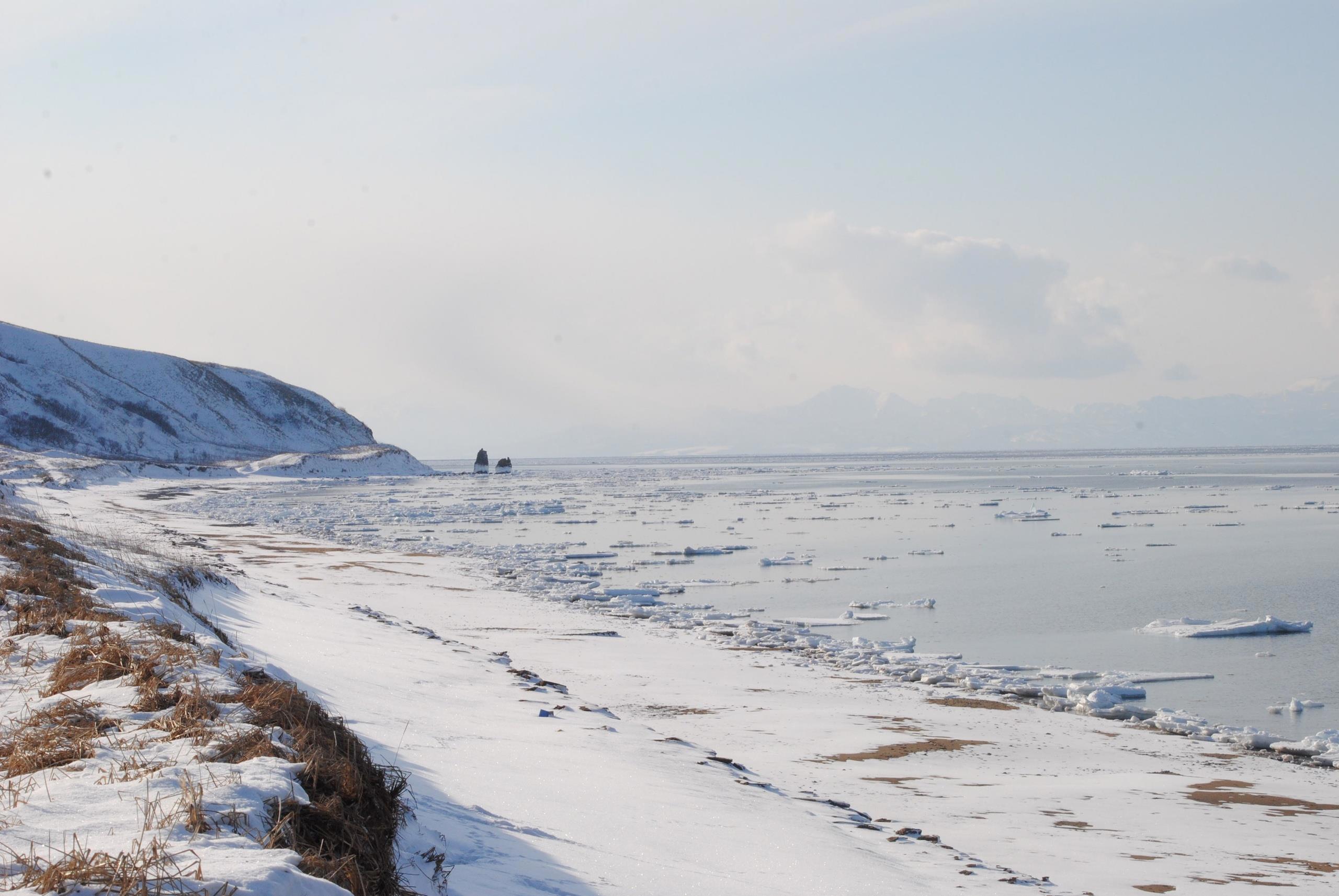 Через 4,5 часа и 8 км дороги, наконец-то берег Охотского моря. Два темных пятнышка у горизонта - кекуры мыса Знаменка, Индей и Иудей. На берегу, как оказалось, лежала морская свинья, знатно ободранная птицами и лисами, но фото не будет. Не стоит, вдруг обедает кто