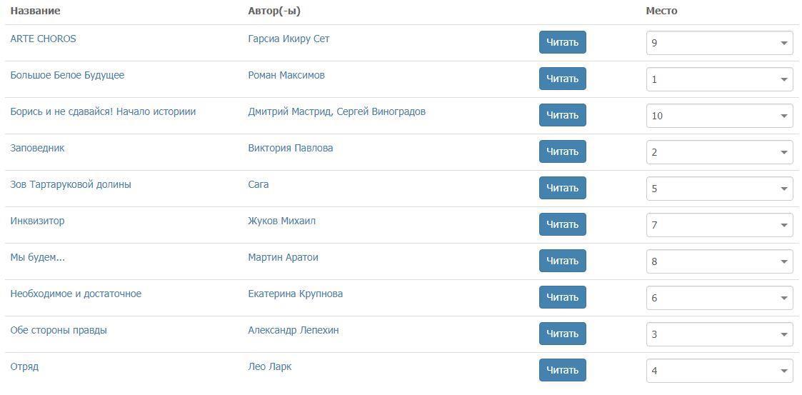 НО меня ждал сюрприз! - работы из-за которых у меня начал дергаться глаз... как итог: пришлось их поставить на 9 и 10 место. Что примечательно: и тут моё мнение не совпало с большинством - рассказ, которому я дал 9-е место вышел во второй тур... ВАУ!!!