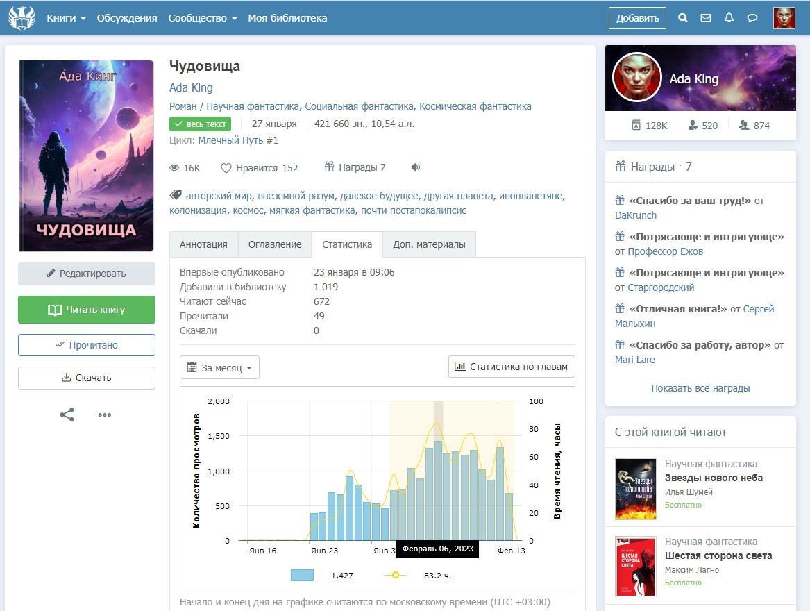 Минимум у одного завершенного и полностью опубликованного на нашем сайте романа (не менее 300 тыс.знаков, не фанфика и не перевода, без эротики) должны быть следующие показатели статистики: