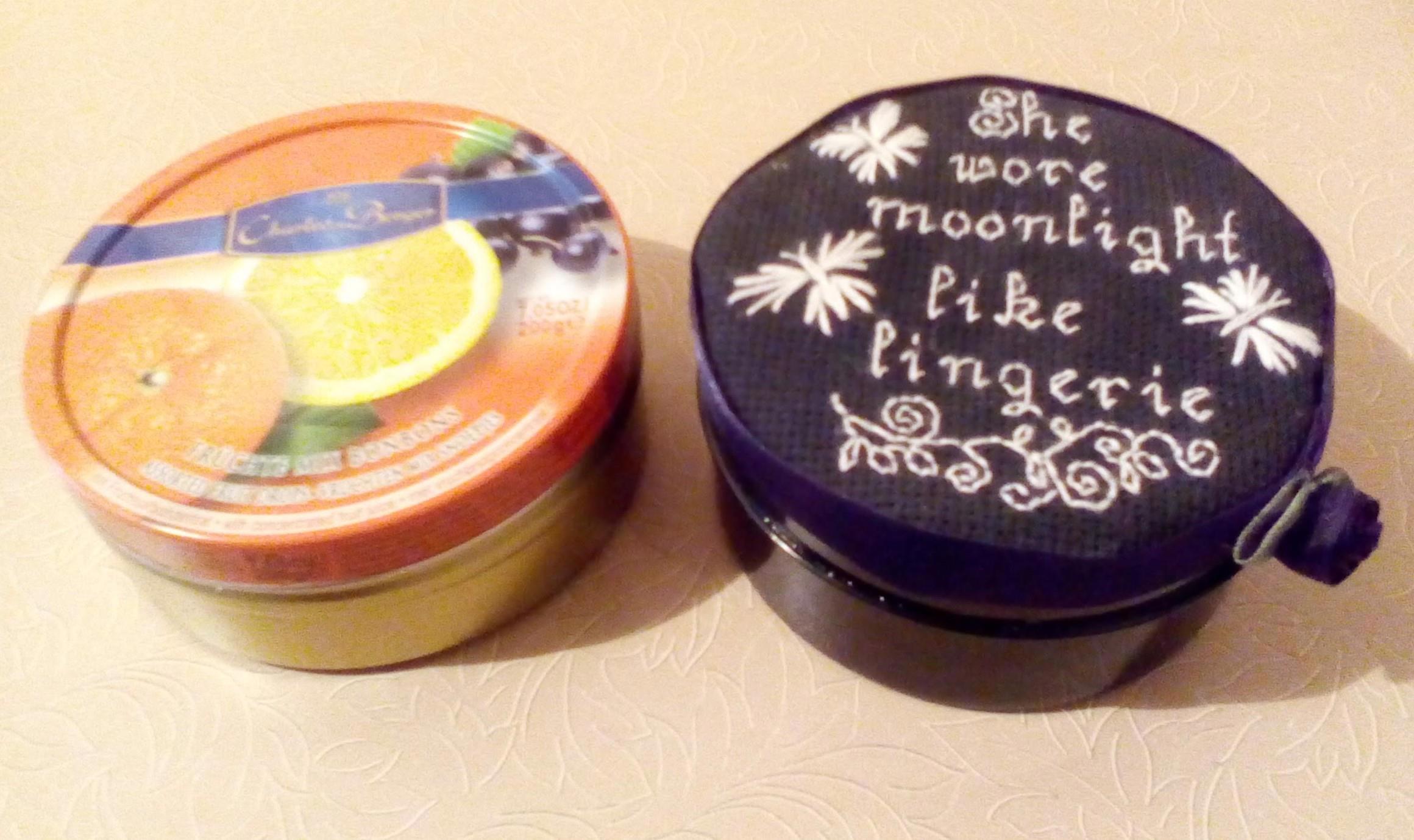 У меня была коробочка из-под монпансье, которую я превратила в шкатулку с помощью чёрной автомобильной краски (которую покупала, чтобы закрасить царапину на Форде), автомобильного лака и ещё кое-каких рукодельных принадлежностей. Получилось что-то такое: