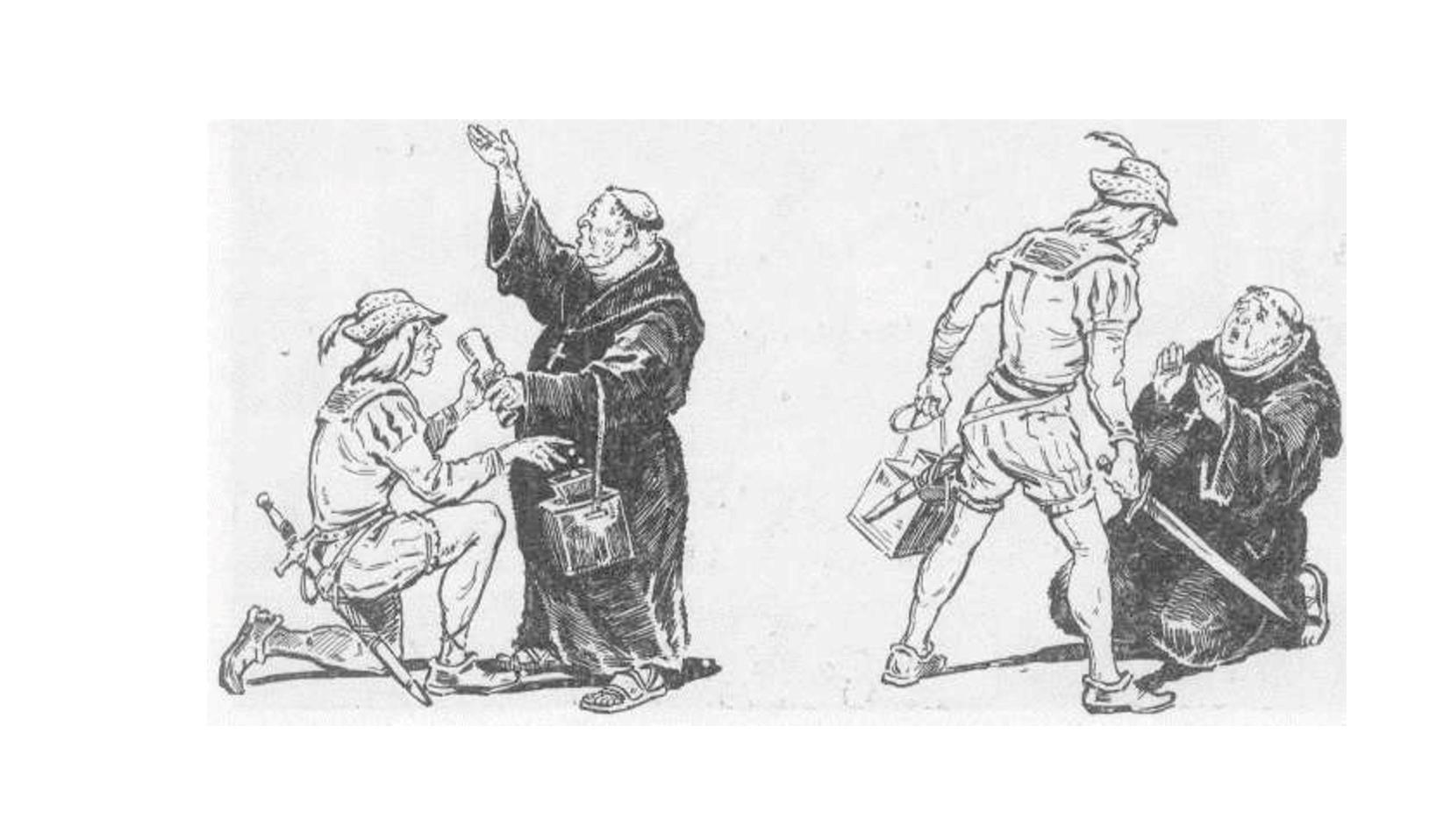 В любом деле, инициированном институтами контроля тела и души, каковыми обычно предстают государство и церковь, непременно находятся те, что стремятся выбиться в первые ученики. Торговля индульгенциями, благословленная Римом, также породила множество фанатиков и новаторов, доведших изначально постыдную идею до вершин цинизма и кощунства. Одним из таких идейных торговцев с горящими глазами и праведной слюной на устах был лейпцигский монах Иоганн Тецель, который разработал целую тарифную сетку для индульгенций за тяжкие грехи: 7 золотых за убийство, 9 за святотатство, 10 за убийство родителей! Однажды к нему обратился человек с вопросом, может ли Церковь простить ему грех, который он только намеревается совершить? Отец Иоганн охотно выписал тому плату за подобную индульгенцию, и сделка была совершена. Довольный собой, Тецель тем же вечером покинул Лейпциг, но на дороге его нагнал тот самый незнакомец. Избив до полусмерти монаха, в конце экзекуции незнакомец объявил, что именно этот грех он и имел в виду … на https://author.today/work/217991/ опубликована двадцать вторая глава романа «Посмертно влюбленные», седьмой книги серии «Kyrie Eleison» о периоде порнократии в истории Римско-католической церкви.