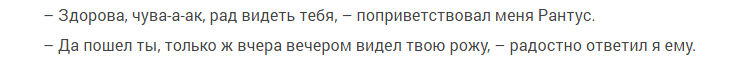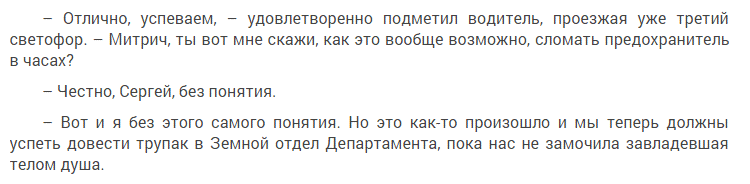"Привет, дружище", "Пошёл ты!". Не знаю, я, мягко говоря, к такому общению не привык, можно и в жбан получить. По крайней мере меня это бы кольнуло. Я чувствительный, знаю. Герой, в принципе, считая себя оптимистичным реалистом, на самом деле, флегматично пессимистичен, ибо чужие проблемы за всё время, что я прочитал, его ни разу не взволновали. Под поезд прыгнули? Ухмыльнулся, пошёл дальше. Неприятный тип, одним словом.