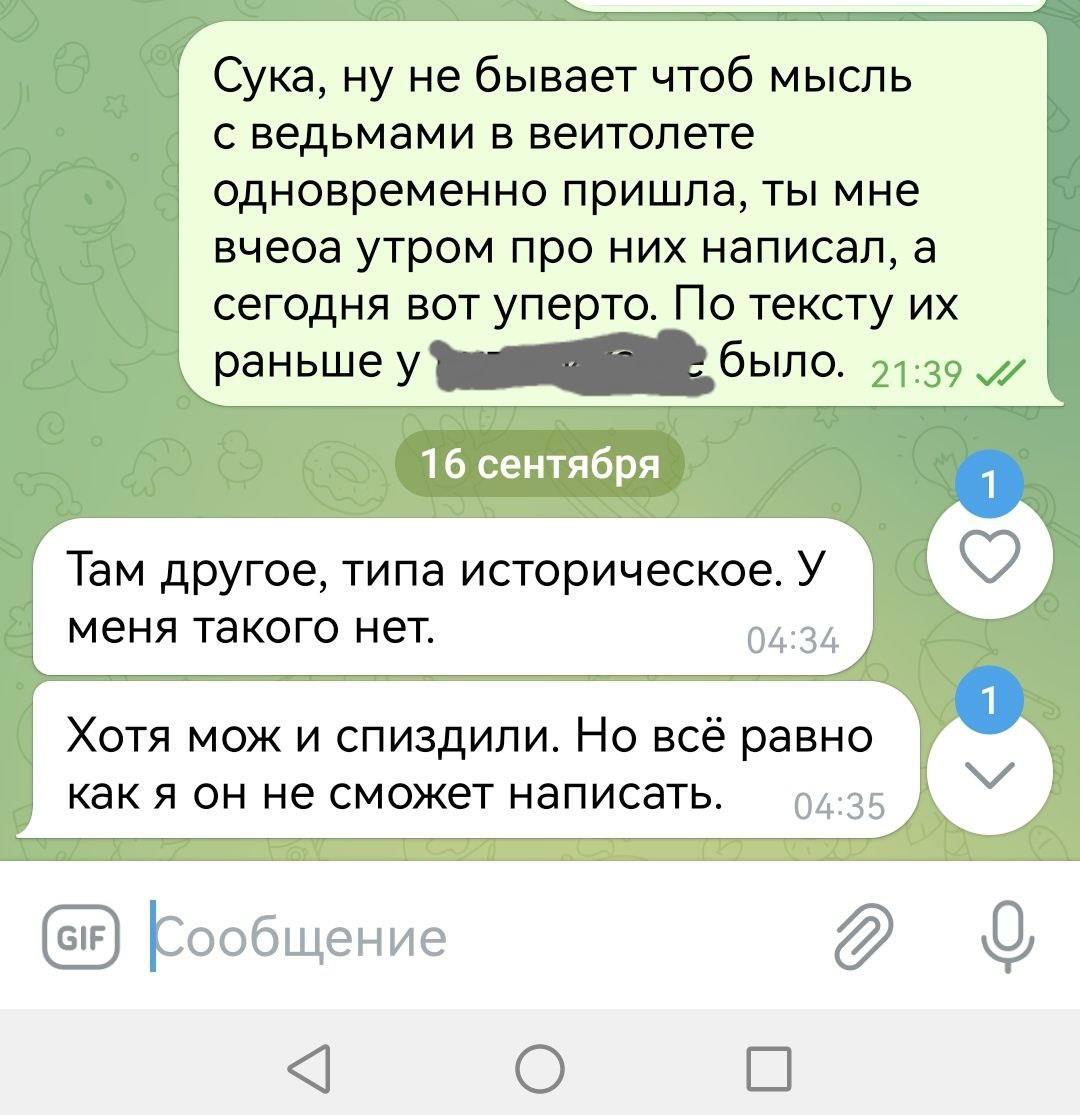 Б: — Это было эпично. Сколько раз я писала, что могу по текстам сказать кто что у кого упер. Кто были авторами первичной идеи, ввернутой последышами. Но тут? Это был фееричный абзац, спереть из комма во флудилке??? я читала текст проды и просто охренивала, да что же это такое!? На ходу подметки рвут, сволочи!!!