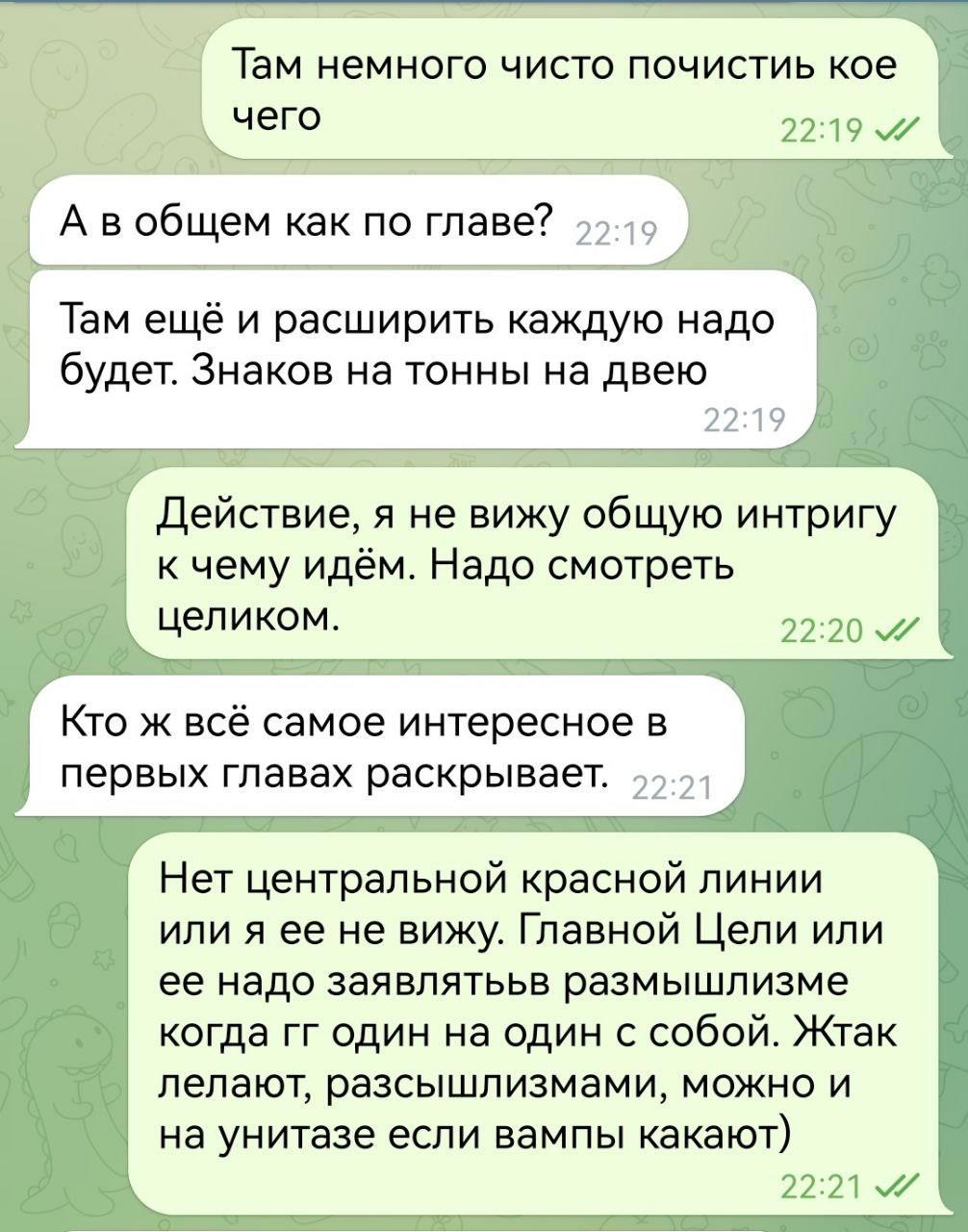 — Ну тогда так и пропиши в тексте, что эякуляция у вампов как из прорвашей трубы, а сиськи от возбуждения не помещаются в лифчике!