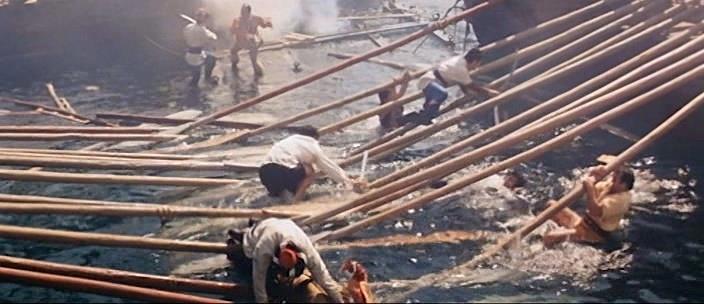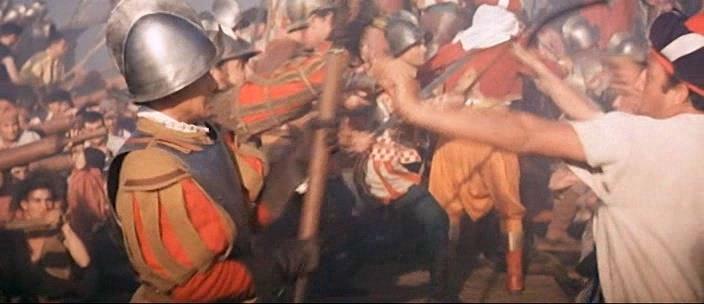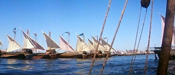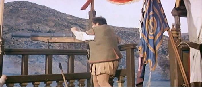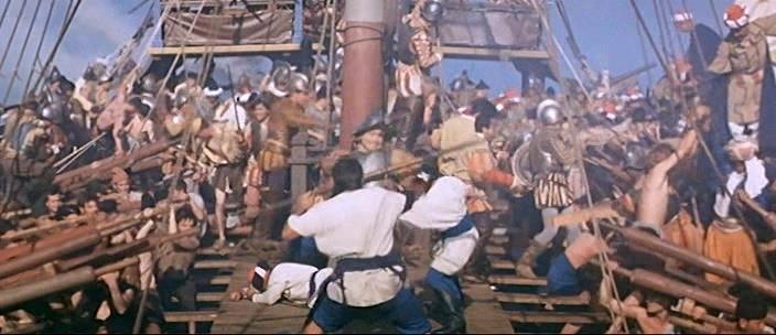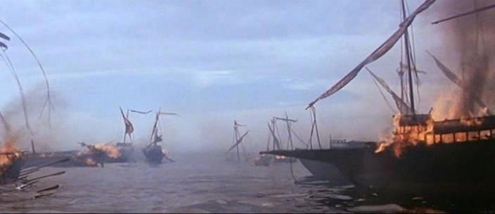 Когда знаешь, какой там был масштаб потасовки, хочется увидеть больше эпичных общих планов. Хочется увидеть не просто рубилово в центре, но и тактические перемещения баталий Барбариго, Сирокко, Улуч-Али и Дориа. Однако, если учесть, что до сего дня я был уверен, что сражение ренессансных флотов было показано только в "Битве трёх королей" (в постановке участвовал СССР) и выглядит очень бедненько, то тут остаётся только расстраиваться за размер кадра. Хочется теперь галерного порно в FullHD.