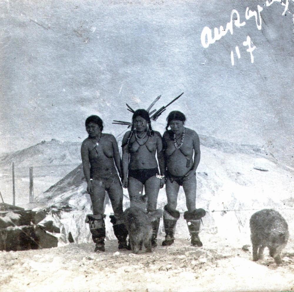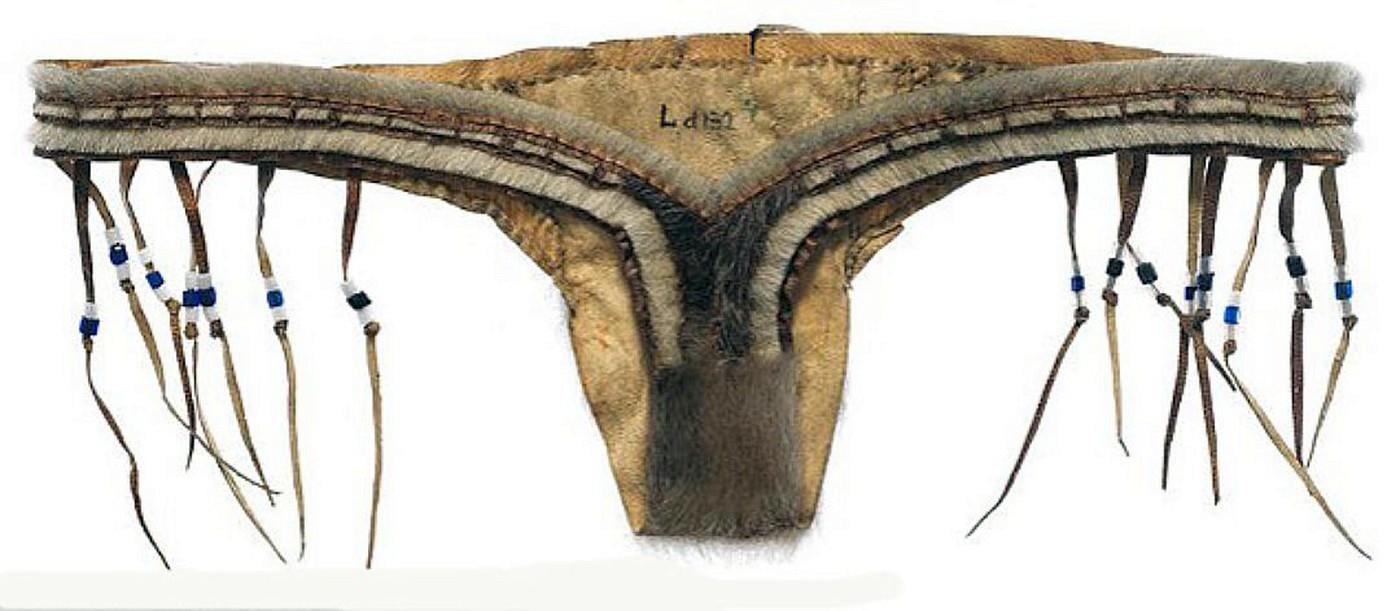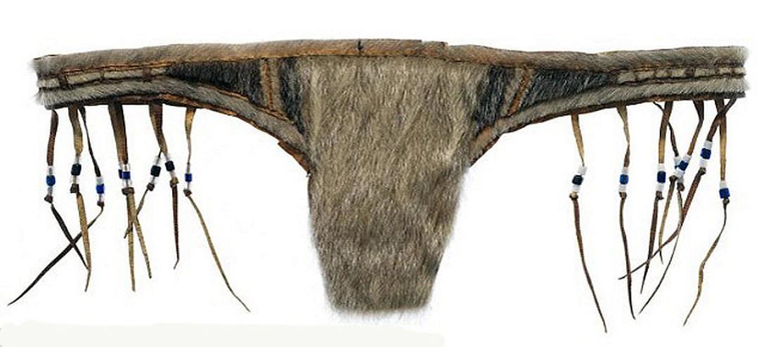 На самом деле стринги изобрели давным-давно. Когда европейские барышни на своих панталонах дырки на коленках ещё штопали, их соседки на Севере в чумах вовсю в этих самых стрингах шастали. В чумах-то тепло, так чего шкуры зря протирать, да и красивше даже так вроде. И вот в 1892 году появляются в гостях у эвенков Гренландии европейские джентльмены в лице капитана Райдера со товарищи, и с большими глазами смотрят на местных барышень, которые голуют по чуму вот в таких красивых нарядах с подвесочками и бусиками, затейливо сшитыми из меха оленя, тюленя и прочих зверюшек (первая фото – вид с переду, вторая – с заду):