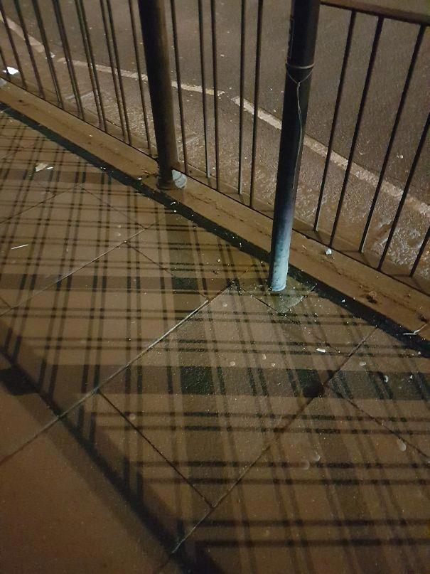 Кто-то слегка припечатался к этой стене на парковке и одновременно создал пасторальную картину маленького городка в снеге.