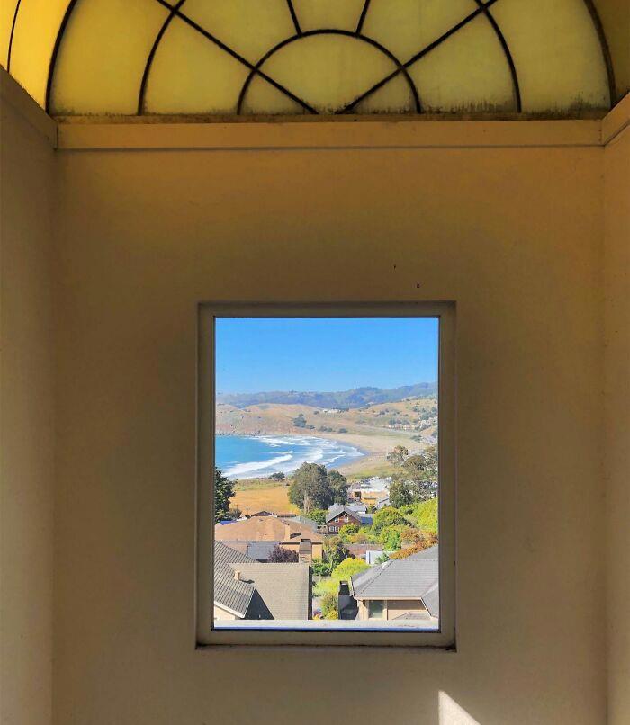Окно в рентованном домике у моря выглядит как произведение искусства на стене.