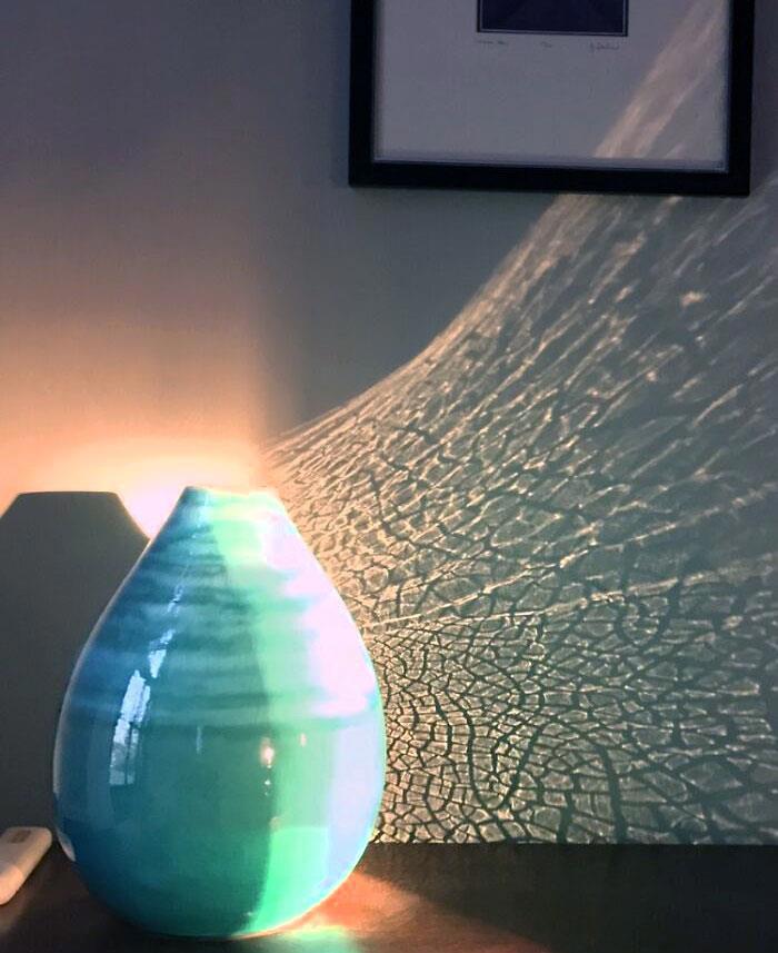 Отражением света от вазы создало необыкновенно красивую структуру на стене.