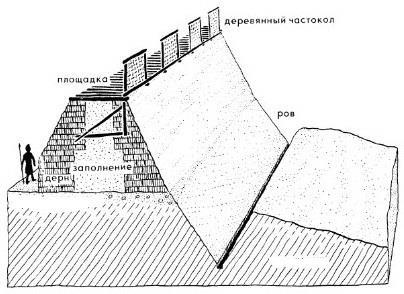 Для защиты от стрел по верху вала ставили парапет из жердей.