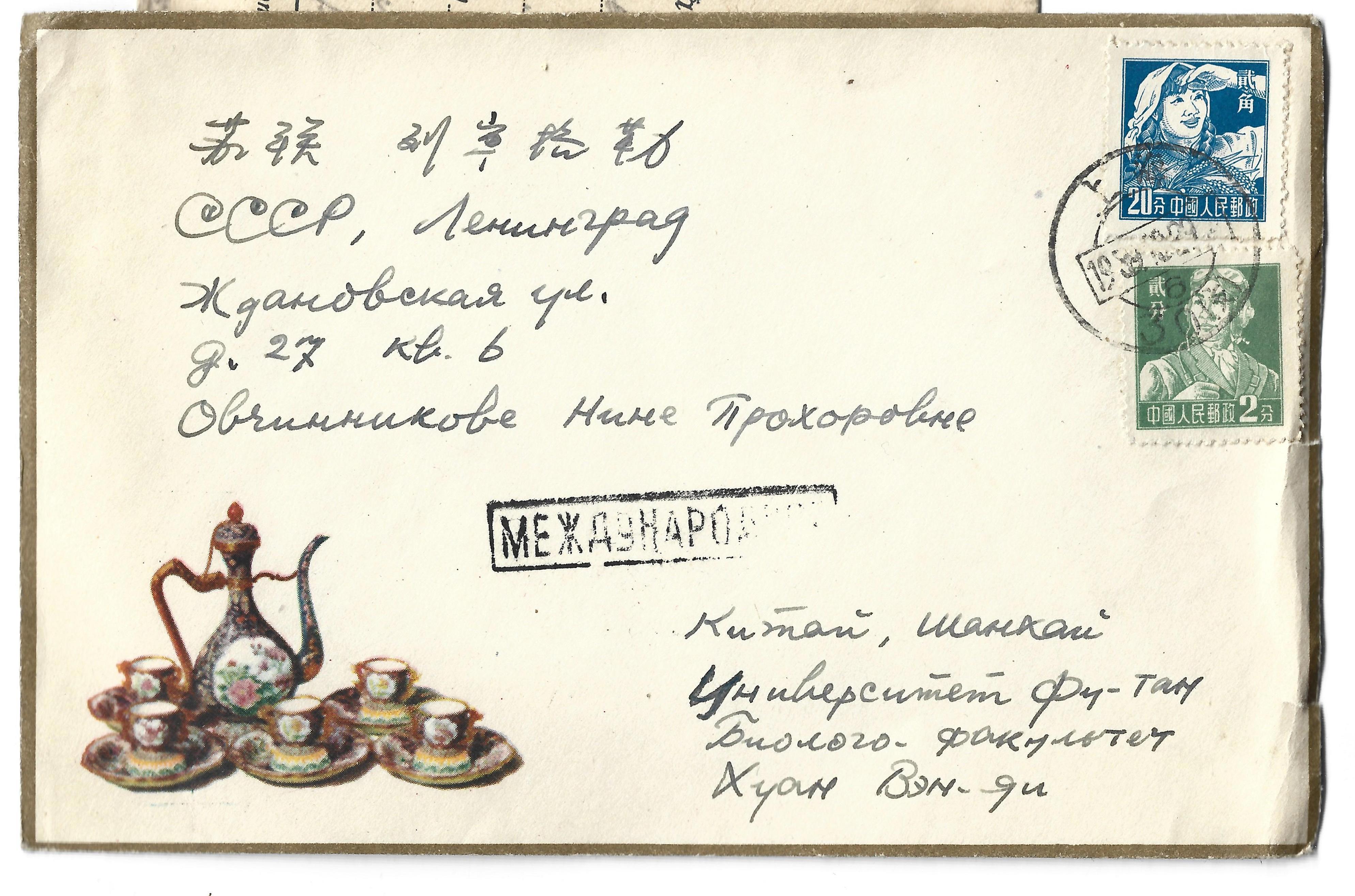 А вот интересный конверт, отсканила целиком, это письмо из Китая времен Великой Дружбы, у матери было тогда много студентов-китайцев: