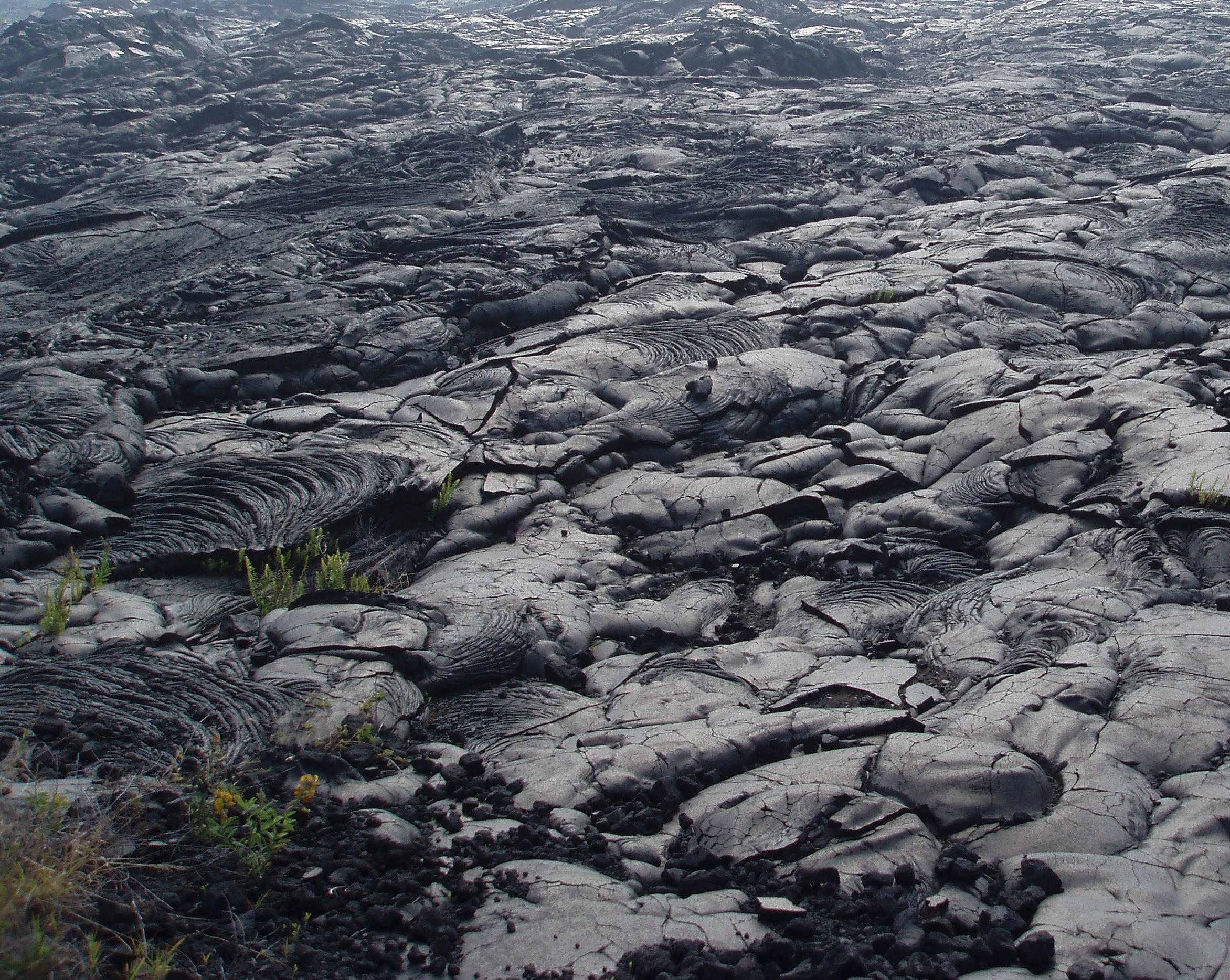 Свежее лавовое поле оказалось волнистым, угольно-черным и весьма обширным. В его центре возвышалась небольшая конусообразная гора — там был кратер, из которого раньше изливалась лава.