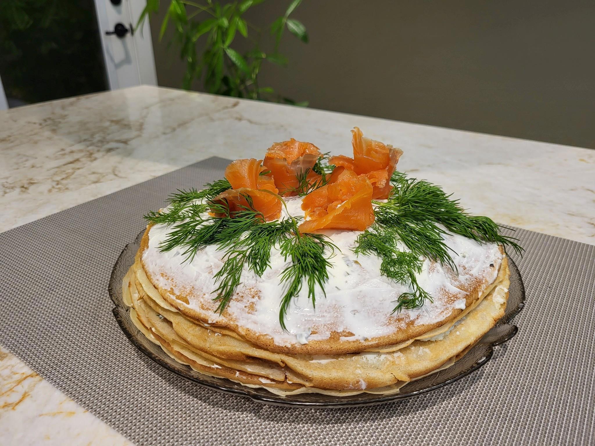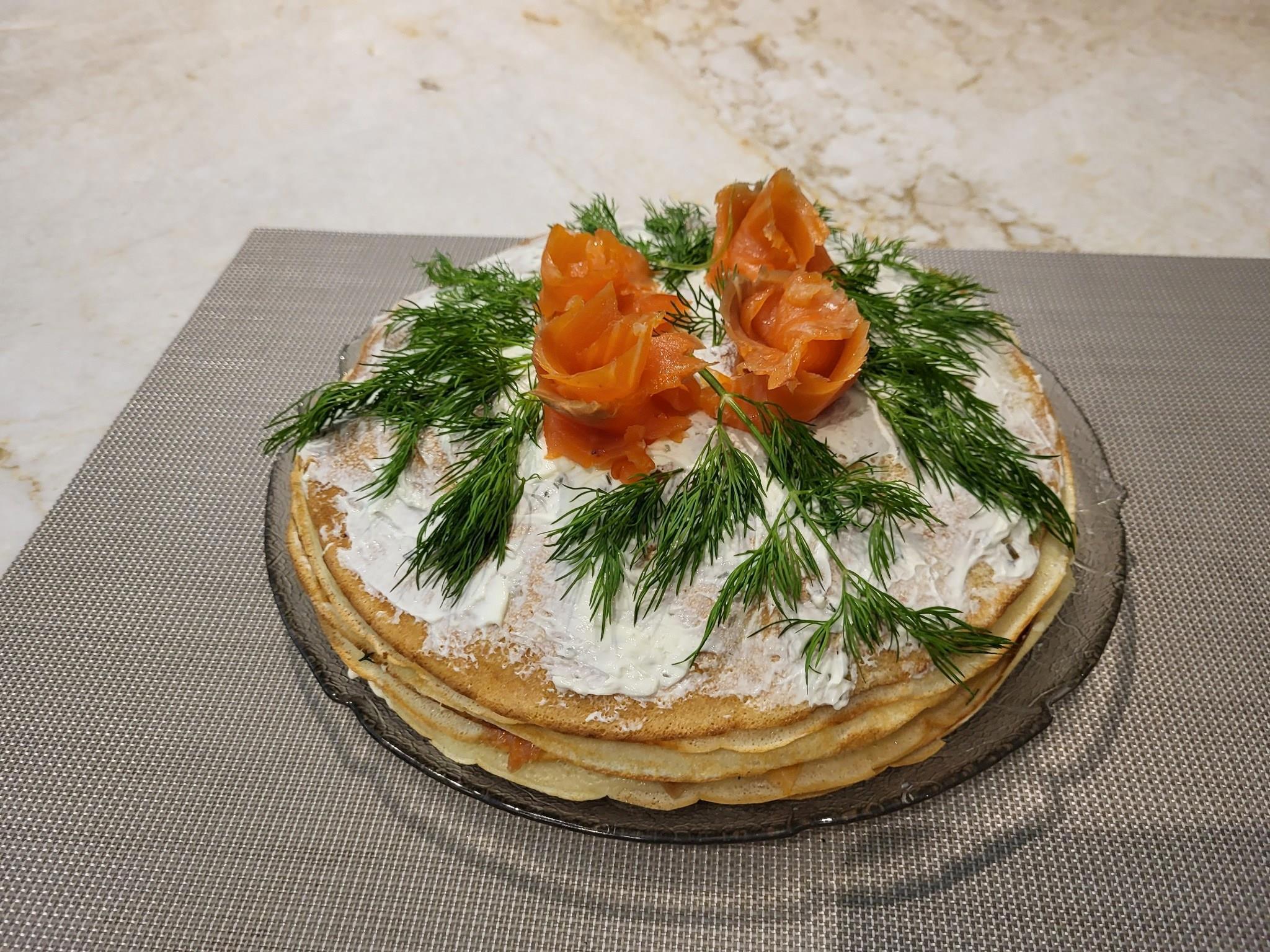 Блинный Масленичный Пирог из 18 блинов и слоёв копчёного лосося, красной икры, мягкого сыра и зелени. От классического этот пирог отличается отсутствием чёрной икры и белой рыбы :))) Но, скажу вам честно, что и без этих двух пропущенных компонентов, пирог получился просто блеск. (Доча сказала : Папа я объелась :), а придумала всю эту вкусноту-красоту моя лучшая половина :)
