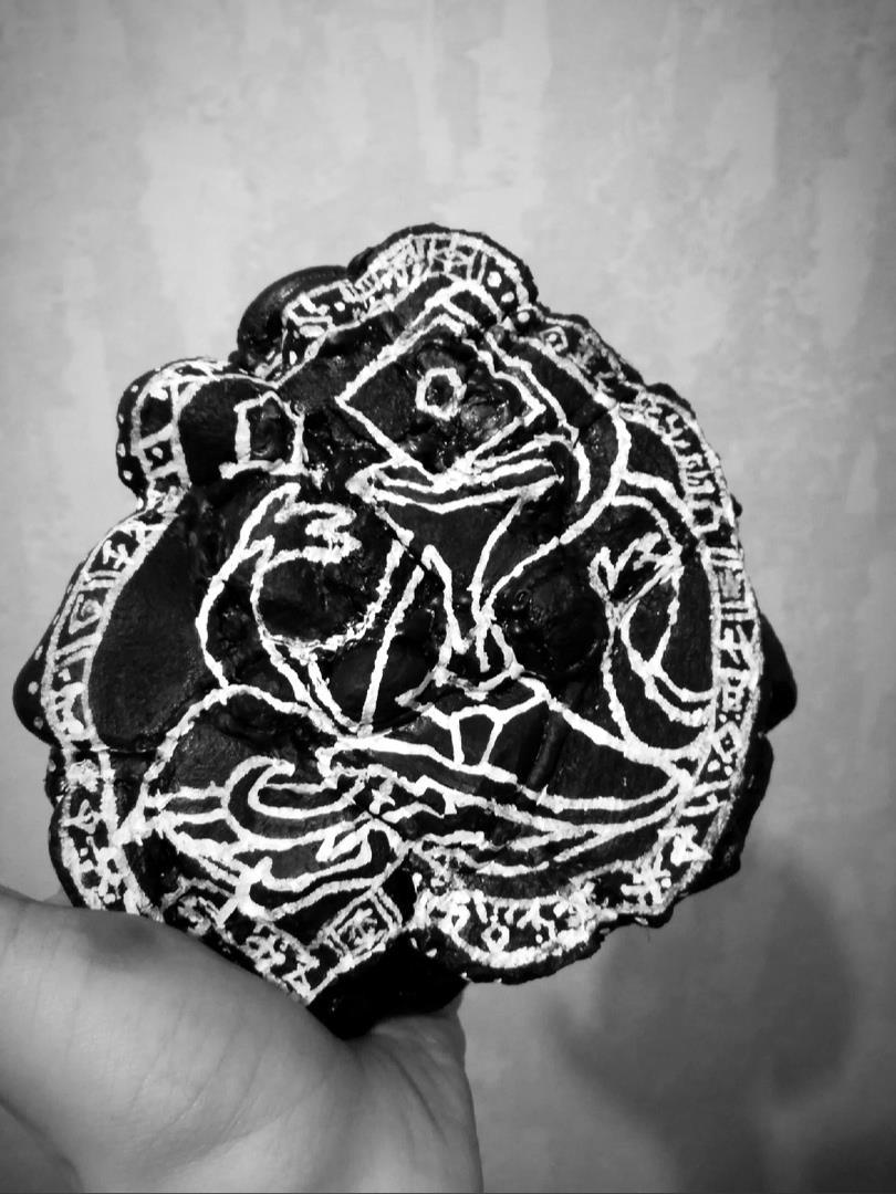 Потом были и другие мелочные артефакты. Но, пожалуй, финальным и самым важным из них стал тот, который я сделал своими руками. Его вы и видите на фото. Это камень, который я сделал из куда более мелких камней и потом вот так покрасил. На нём изображён Исполнитель Желаний - главная сущность в моей вселенной, что выше любых богов. Миф о нём написан по краям. В общем, стоит и радует по сей день.