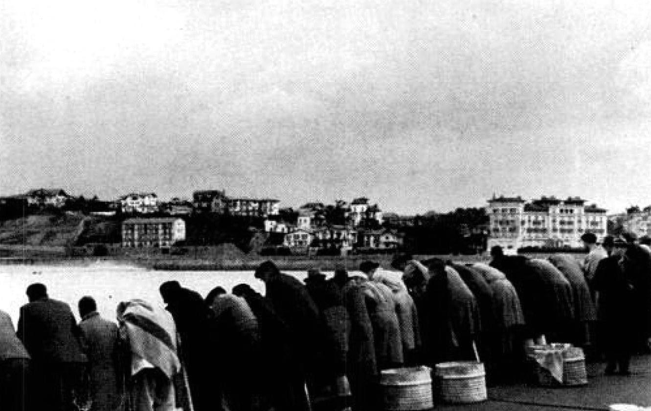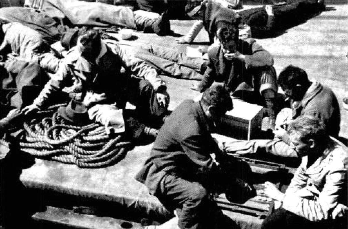 В гавани Сен-Жан-де-Люз немецкий флот посадил "Дрезден" на мель, что привело в ярость капитана Ягера и привело в восторг замзамовцев, которые стояли у поручней и наблюдали за тщетными попытками минных заградителей снять судно. Бочки на переднем плане содержат воду для мытья, по литру на человека.