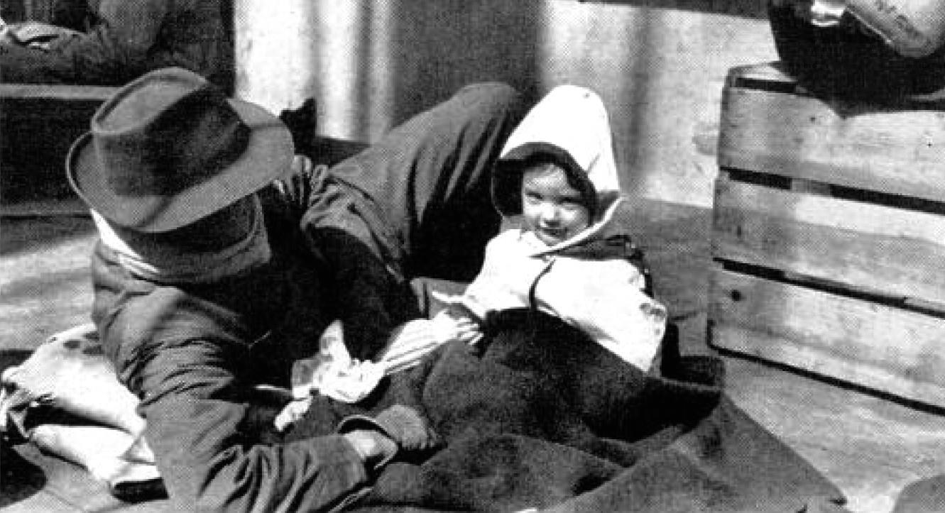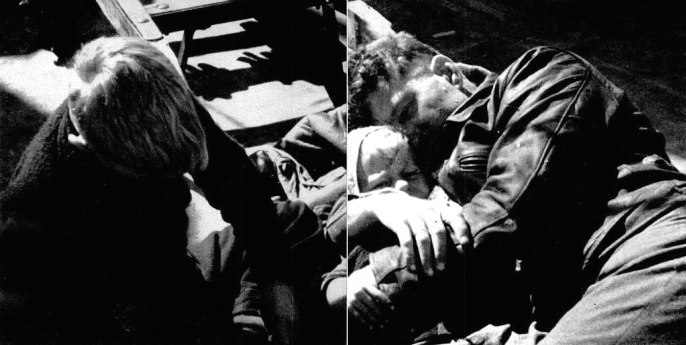 Томми Миллер, еще один табачник, несет брыкающегося, кричащего Питера в лодку. Мать и дети сейчас находятся в плену у немцев.