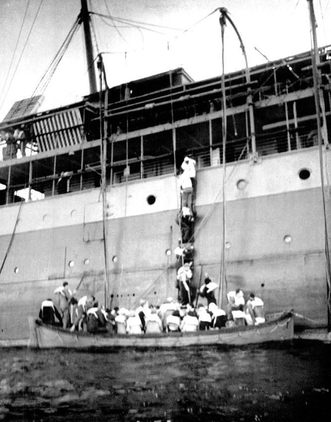В 3-ю спасательную шлюпку, уже битком набитую людьми, еще пятеро обезумевших пассажиров и членов экипажа пытаются попасть по трапу, спускающемуся со стороны Замзама. Член экипажа, стоящий у трапа в лодке, машет им в ответ. Человек у подножия лестницы - католический священник. Одна шлюпка (вверху слева) так и не была спущена на воду, другая рядом с ней застряла на солнечной палубе. Снаряды по левому борту разрушили лодки 4 и 9, раскололи корпуса двух других, которые позже были затоплены с кораблем. Спокойное море спасло много жизней, но сильная зыбь затрудняла посадку на качающиеся лодки и удержание их вблизи корабля.