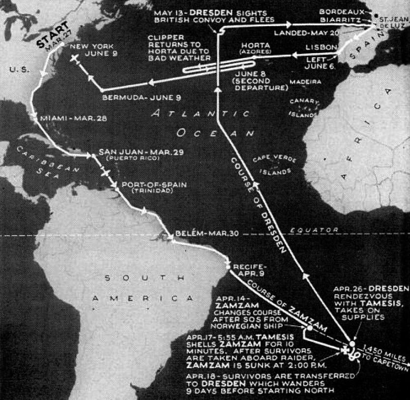 "Дрезден" также был новым кораблем, построенным в 1937 году. Судно стояло в Сантосе, Бразилия, до 18 марта, когда вышло в море с грузом пшеницы, овса и хлопка для Германии. В него также входило топливо для рейдера.