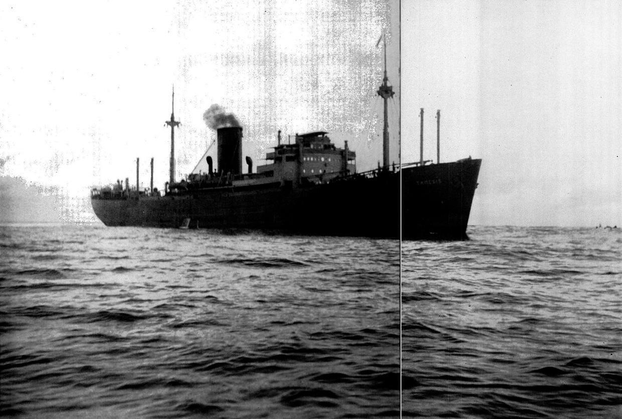 “Тамесис” осторожно приближается к цели через 10 минут после обстрела, в окнах его рубки отражается восход солнца в Южной Атлантике. Пассажиры в покачивающихся спасательных шлюпках или плавающие в воде задаются вопросом, приближается ли она к пулеметным катерам, прикончившим Замзама без следа. В реестре Ллойда Timesis значится как норвежское грузовое судно водоизмещением 7156 тонн, построенное в Данциге в 1939 году, зарегистрированное в Тонсберге. Но не исключено, что немцы используют это название в качестве прикрытия. Название "Тирана" было написано на корабельном колоколе. Судно представляло собой одновинтовой моторный корабль с эллиптической кормой. Быстрее, чем она выглядела, она, вероятно, могла бы делать 18 узлов. Сбитые с толку пассажиры, взобравшиеся на борт по веревочным лестницам и согнанные к трюму в середине судна под охраной морской пехоты, увидели фальшивую парусиновую надстройку прямо за рубкой. На нем работала тщательно подобранная команда из нескольких сотен крепких молодых нацистов в возрасте от 19 до 30 лет, а его капитан, красивый гигант по имени Рогге, имел полное звание ВМС Германии. На его безупречно чистых палубах рядами стояли бочки с маслом, а проходы внизу были забиты 75- и 155-миллиметровыми пороховыми канистрами. На ее боках не было боевых шрамов. Некоторые офицеры “Тамесис" намекали, что она вступила в бой с британскими вооруженными торговыми судами “Карнарвон Касл" и "Алькантара" в 1940 году, однако (поскольку это был рейдер, который прикончил норвежский китобойный флот в Антарктике, "Тамесис" установил два орудия на корме, одно по меньшей мере 6-дюймовое, другое переднее и, вероятно, торпедные аппараты В течение пяти часов во время передачи добычи "Замзам" на мостике "Тамесис" несли вахту четыре человека. Фотограф Шерман сделал этот снимок со спасательной шлюпки, подвергая себя большому личному риску, и контрабандой доставил его обратно в Сша. Это одна из фотографий, которую нацисты больше всего стремились скрыть.