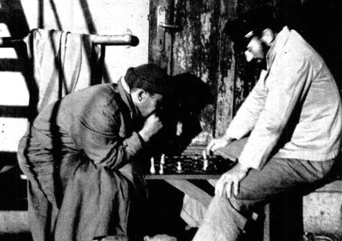 Водитель скорой помощи Генри Эмшаймер из Нью-Йорка играет в шахматы на кормовой палубе с Эдвардом Стоком, плотником «Дрездена» из Бреслау. Плотник Сток не говорил, сколько времени потребовалось, чтобы отрастить бороду, опасаясь выдать общее время, проведенное «Дрезденом» в море.