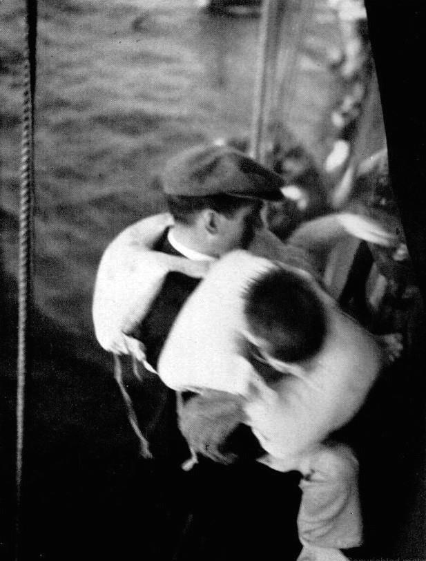 Немцы на войне не тратят времени на церемонии. Когда каждая лодка причалила к вертикальному трапу, нам грубо, но вежливо приказали подняться, и немецкие моряки спрыгнули вниз, чтобы помочь женщинам и детям. Для раненых опустили носилки. Маленькие дети поднимались наверх в пеньковых корзинах, жалобно плача.