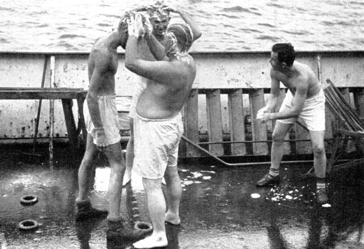 Первый сильный дождь, 4 мая. Мужчины радостно намыливаются скудным запасом мыла. Пресной воды было очень мало. Обратите внимание на домашние метательные кольца.