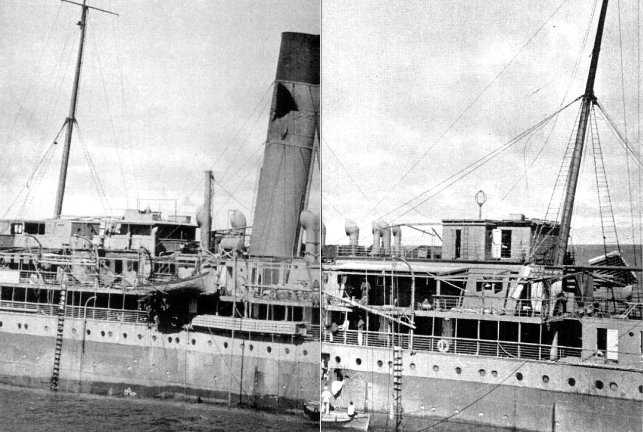 Из 55 осколочно-фугасных снарядов, выпущенных нацистским рейдером по "Замзаму" без предупреждения, наибольшие повреждения были нанесены по левому борту в средней части судна. Первый удар снес антенну. Трое мужчин справа были ранены взрывами под разбитой спасательной шлюпкой и рядом с дверью над немецкой моторной лодкой. Немцы забирают багаж с нефтью, провизию, спиртное, поскольку трюм медленно заполняется.