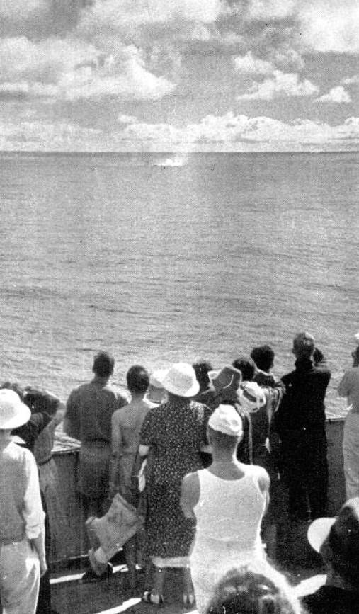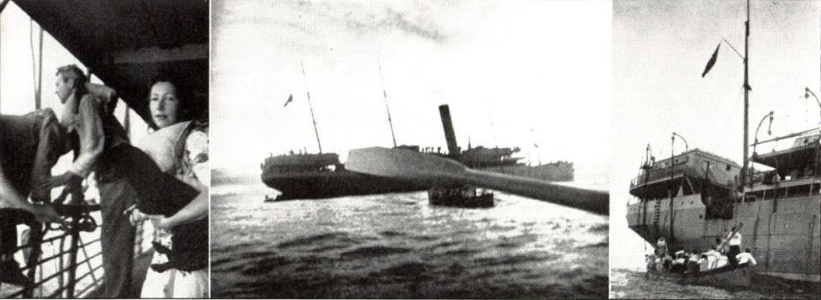 На приведенной ниже фотографии впервые показан ущерб, нанесенный Замзаму после его десятиминутного утреннего обстрела без предупреждения или запроса. В тот день в 2 часа дня немцы заложили на борт у каркаса три бомбы замедленного действия, и через десять минут он пошел ко дну, Шерман фотографировал его конец с палубы Tamesis (вверху). Все пассажиры-заключенные были переведены на "Дрезден", за исключением трех раненых, показанных справа, в больничной палате нацистского рейдера. Потом " Tamesis " отчалил, а теперь, восемь месяцев спустя таинственно исчез из Южной Атлантики вместе со своими тремя ранеными пленными. Даже немцы говорят, что уже несколько месяцев ничего о нем не слышали.