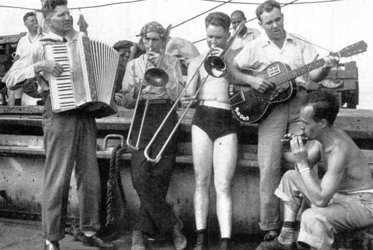 Фотограф LIFE Шерман (справа) и его окарина присоединяются к миссионерской группе. Слова на гитаре: “My Best for Christ” и “Jesus Saves”. Любимый гимн: Скала веков.