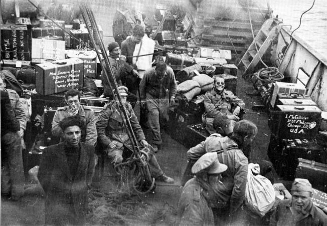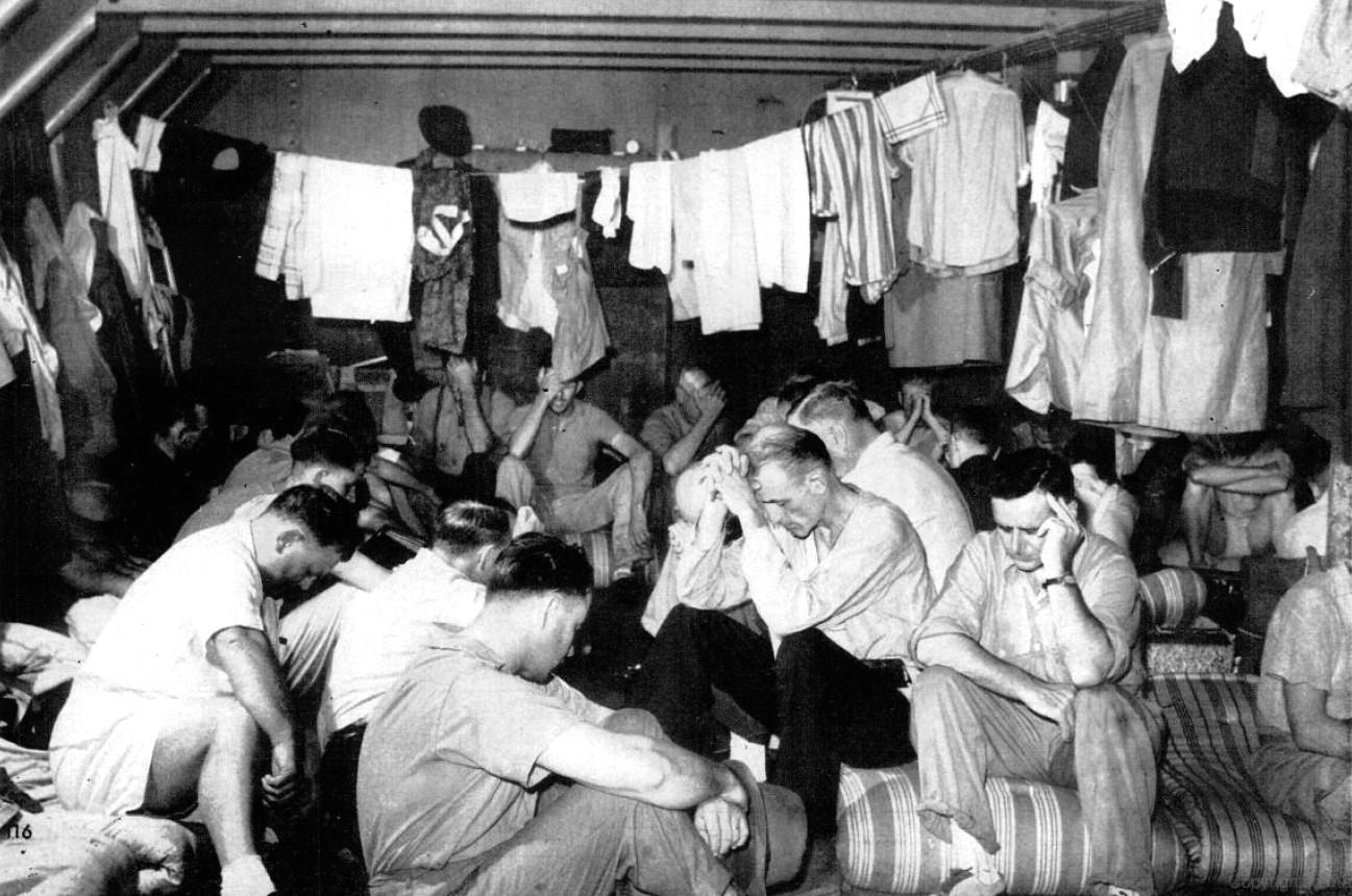 Картинка на следующей странице похожа на мрачную съемочную площадку концентрационного лагеря. На самом деле это трюм немецкого круизного лайнера "Дрезден", в котором все белые мужчины затонувшего "Замзама" провели все темные часы 33 дней в своем круговом путешествии к твердой земле в оккупированной Франции. Персонажи в этом сеттинге составляют конгломератный актерский состав. Самая большая группа состоит из миссионеров различных протестантских сект, праведных, бережливо живущих людей, которые отправились проповедовать Слово среди чернокожих Южной Африки. Есть ищущие приключений молодые американцы из хорошей семьи, которые вызвались водить машины скорой помощи для Свободных французов в Африке. Большинство из них собрались у дальней стены. Есть франко-канадские священники, предназначенные для Басутоленда. Есть покупатели табака из Каролины. Все из этих четырех групп оставались до конца в значительной степени разделенными и объединенными. Но под руководством внештатного редактора журнала Fortune Мерфи они работали вместе, чтобы выжить.