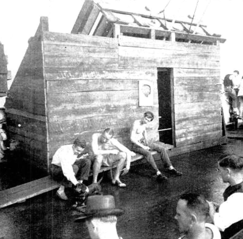 На люке № 2 мужчины днем бездельничают рядом с уборной (справа). Эта тропическая часть путешествия к северу от Экватора была самой приятной, хотя в душные ночи на палубе иногда становилось слишком жарко для босых ног. Главной опасностью был солнечный удар.