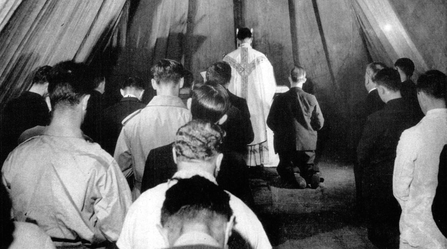 КАТОЛИЧЕСКАЯ МЕССА ПРОВОДИТСЯ В 6 ЧАСОВ УТРА ПОД БРЕЗЕНТОВЫМ ТЕНТОМ НА КОРМОВОЙ ПАЛУБЕ ОДНИМ ИЗ 17 ФРАНКО-КАНАДСКИХ СВЯЩЕННИКОВ. В УНИФОРМЕ (СЛЕВА) - ВОДИТЕЛИ СКОРОЙ ПОМОЩИ.