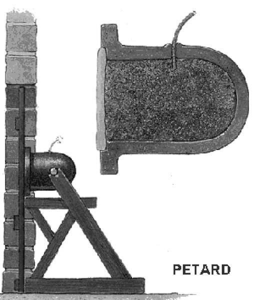 Из источника, отправные данные которого неизвестны следует, что изобретение этой петарды относится к 1574 году и появилась она впервые во Франции ( но подрыв ворот порохом конечно применялся и ранее).