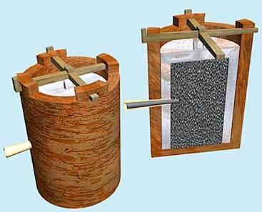 Большой сосуд имеет в верхней части проушины, в которые вставлены деревянные клинья, предназначенные для удержания малого сосуда внутри большого.