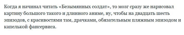 А вот фрагмент свежего отзыва на мой роман "Безымянные солдаты" (от совершенно другого человека).