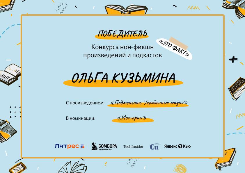 Автор: Кузьмина ОльгаОчень радовалась, когда моё историко-фольклорное исследование "Подменыши. Украденные жизни" прошло сначала в лонг-лис, а потом в шорт-лист конкурс "Это факт" на ЛитРес. Но на победу не рассчитывала, всё-таки для номинации "История" это специфическая книга. И вдруг...