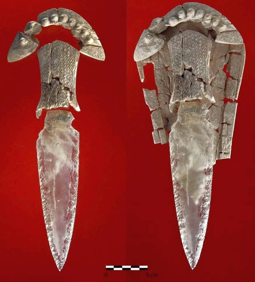 Изначальные размеры кристалла, использованного для изготовления кинжала были не менее чем 60 на 220 мм. Ближайшие два источника такого материала нашли в сотнях километров от захоронения. Груз, конечно, не велик, однако ж всё равно – это ещё нужно доставить. Добавим к этому высокую трудоёмкость и ещё более высокие требования к мастерству изготовителя и становится ясно, что речь о какой-то случайности идти не может. Как выглядело всё изделие можно посмотреть вот на этом эффектном фото: