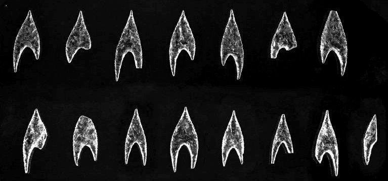 Групповое захоронение выделяется тем, что одежда покойных была очень богато украшена десятками тысяч «бусин». Полагаю, речь идет о бисере. Но и бусы тоже нашли. Причём из янтаря. Откуда привезли янтарь, что за материал использовали для бисера, не пишут и фотографий не показали. Где-то там же нашли некоторое количество очень необычных наконечников для стрел. Посмотрите – вот они: