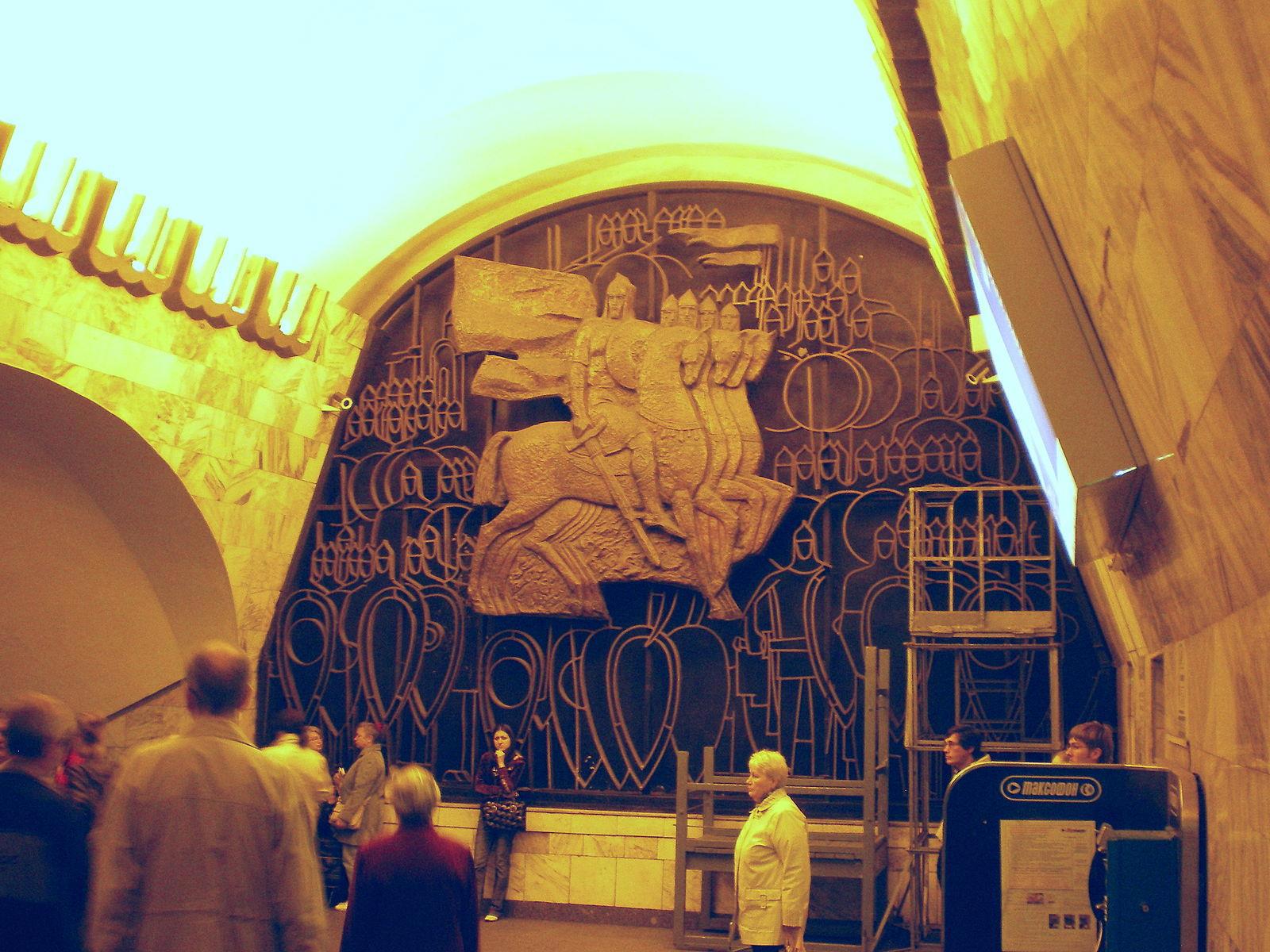 В питерском метро в переходе между одноименными станциями «Площадь Александра Невского» есть барельеф (тоже скульптура, посему сюда) — «Пять мужиков на четырех конях»: