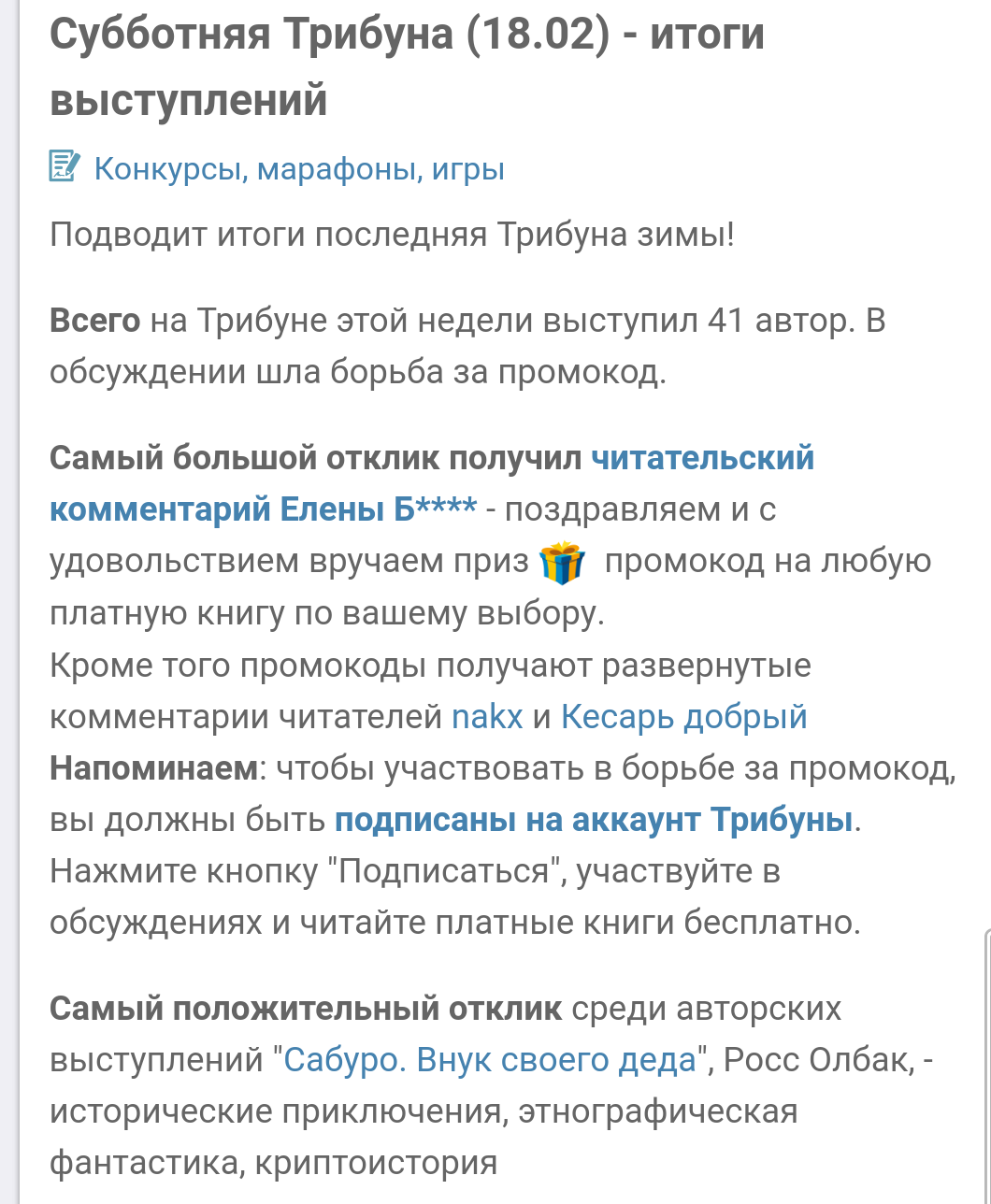 Автор: Росс ОлбакОгромное спасибо всем друзьям, читателям и подписчикам! Оглашены результаты последней Субботней Трибуны. К моему изумлению, книга о приключениях Сабуро заняла первое место, получив наибольшее количество откликов! Кроме того, трое из моих комментаторов, уважаемые Елена Б****, nakx и Кесарь добрый получают от устроителей Трибуны призы в виде промокодов! Простите за обилие восклицательных знаков, но как ещё на это реагировать? Только восторженно!