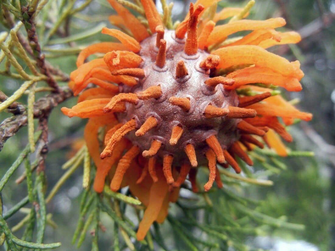 Этот нарост, похожий на сотню желейных щупалец, — последствия влияния патогенного гриба. Он появляется на деревьях (яблонях, кедрах и некоторых видах можжевельника) и вырастает в оранжевую бесформенную массу прямо из их листьев.