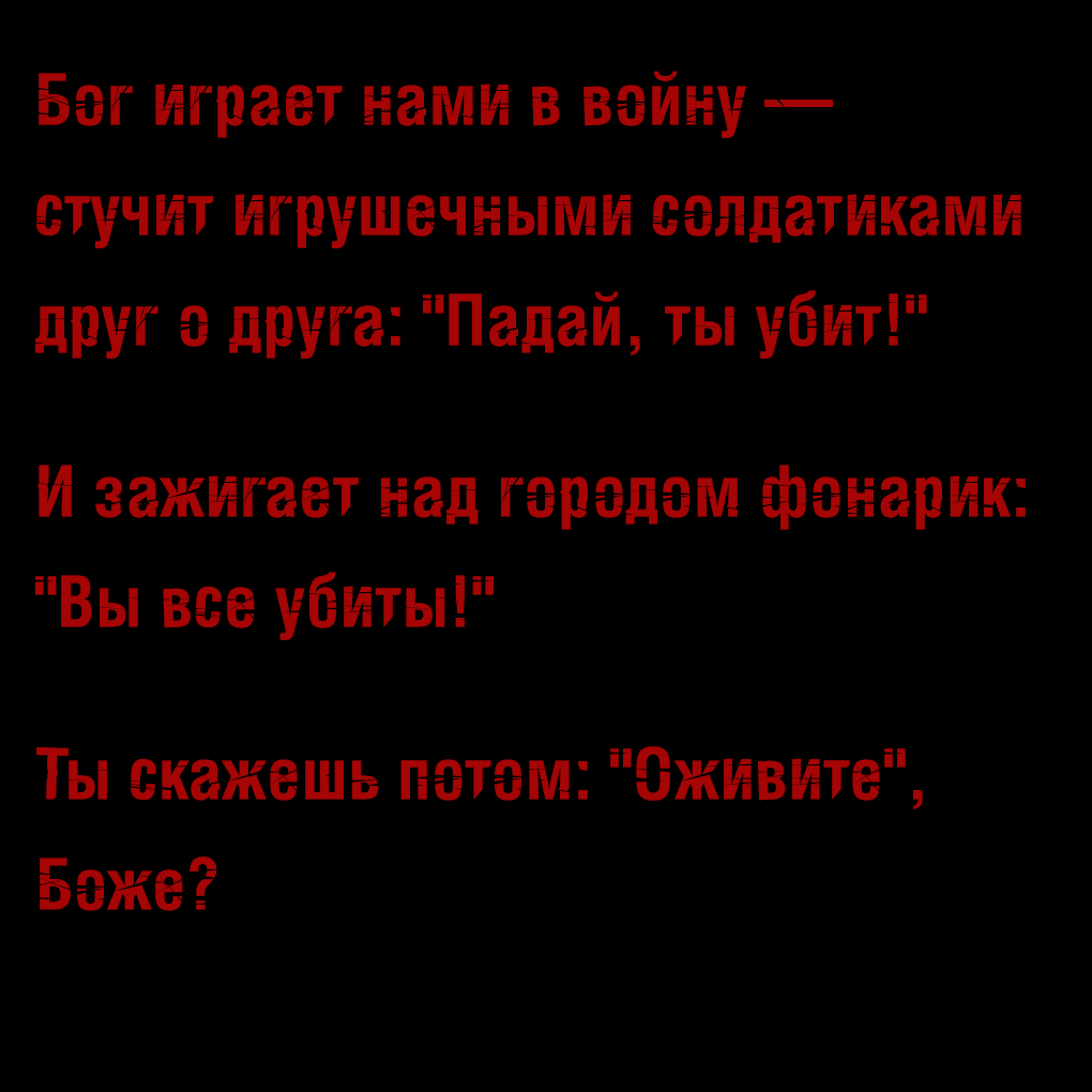 Бог играет нами в войну — стучит игрушечными солдатиками друг о друга: "Падай, ты убит!" И зажигает над городом фонарик: "Вы все убиты!" Ты скажешь потом: "Оживите", Боже?