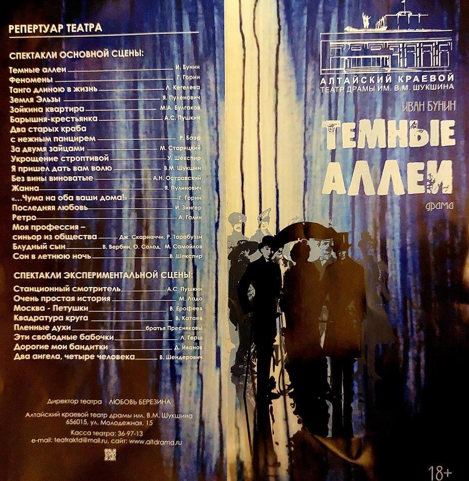 В середине октября прошлого года водил дядю на этот спектакль. В нашем театре Пушкина довольно сильная труппа и талантливый режиссер Олег Рыбкин. Дядя уже был очень слаб, 89 лет - солидный возраст, но на спектакль собрался и смотрел его с воодушевлением. В ранней молодости дядя и сам участвовал в постановках театра Пушкина, в основном в массовках, так что у него это давняя страсть, густо замешанная на воспоминаниях. А в конце ноября его не стало, так что теперь "Темные аллеи" в моем восприятии тесно связаны с памятью о дяде, человеке влюбленному в искусство, театр, музыку, книги и при этом всю сознательную жизнь проработавшему в строительстве, бригадиром, прорабом, мастером участка...