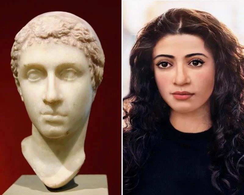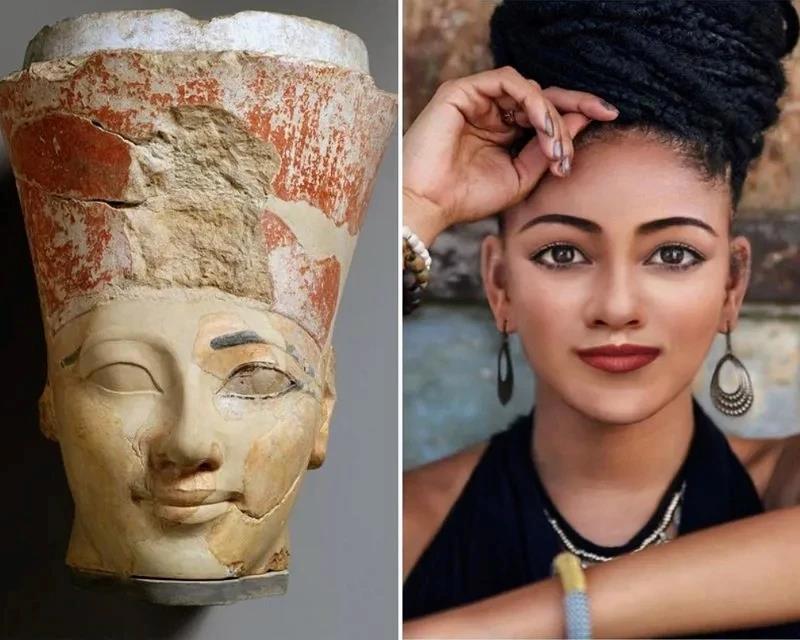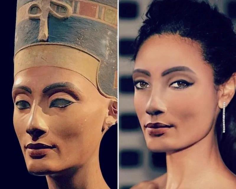 Египетская королева Нефертити. Она правила вместе с Эхнатоном, фараоном того времени. Используя технологию, мы можем представить, как бы она выглядела сегодня.