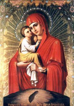 История этой чудотворной иконы Богоматери неразрывно связана с Почаевским монастырём в честь Успения Пресвятой Богородицы (Украина). На горе, где ныне расположена Успенская Почаевская лавра, в 1340 году поселились два инока. Однажды один из них после молитвы пошёл к вершине горы и вдруг увидел Богородицу, стоящую на камне, словно объятую пламенем. Он позвал другого инока, который был также удостоен созерцать чудесное явление. Третьим свидетелем видения был пастух Иоанн Босой. Увидев необычный свет на горе, он поднялся на неё и вместе с иноками стал прославлять Бога и Его Пречистую Матерь .Сама же Почаевская икона Божьей Матери появилась в обители следующим образом. В 1559 году митрополит Неофит из Константинополя, проезжая через Волынь, посетил жившую в имении Орля, недалеко от Почаева, дворянку Анну Гойскую. В благословение он оставил ей привезённую из Константинополя икону Богородицы. Вскоре стали замечать, что от Почаевской иконы Богородицы исходит сияние. Когда в 1597 году перед иконой исцелился брат Анны Филипп, она передала образ инокам, поселившимся на Почаевской горе.